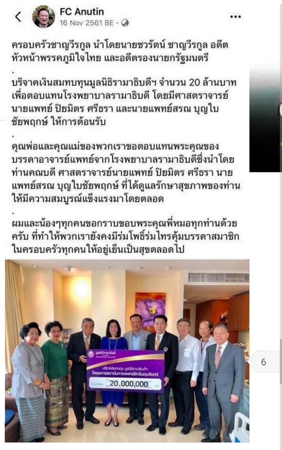ย้อนไปเมื่อปี 2561 "ครอบครัวชาญวีรกูล" นำโดย ชวรัตน์ ชาญวีรกูล อดีตรองนายกรัฐมนตรี และหัวหน้าพรรคภูมิใจไทย ได้เคยบริจาคเงิน 20 ล้านบาท ให้แก่โรงพยาบาลรามาธิบดี โดยมี นพ.สรณ อยู่ในคณะแพทย์ผู้รับมอบด้วย (ตามรูปประกอบ)