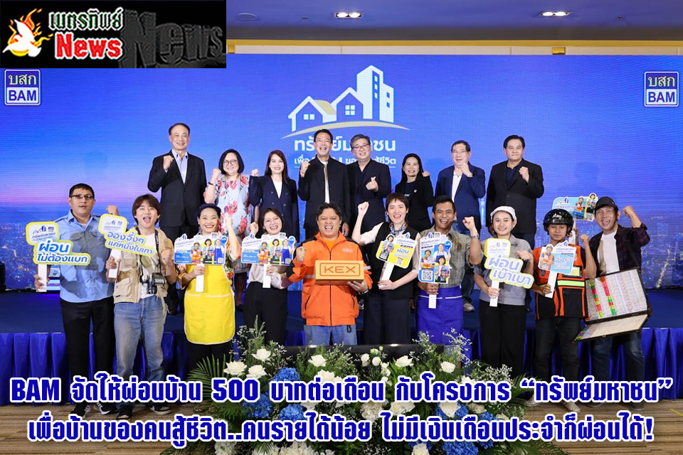 ดีลเด็ด! คนรายได้น้อยไม่มีเงินเดือนประจำก็ผ่อนบ้านได้ BAM เปิดตัวโครงการ “ทรัพย์มหาชน” เพื่อบ้านของคนสู้ชีวิต สร้างโอกาสใหม่ให้คนไทยเข้าถึง “บ้าน” อย่างแท้จริง ในราคาจับต้องได้ ผ่อนตรง กับ BAM แบบสบาย ๆ เริ่มต้นเพียง 500 บาท ต่อเดือนระยะเวลานาน 20 ปี อัตราดอกเบี้ยพิเศษปีแรก 0% ปิดยอดภายใน 3 ปี รับโปรโมชันฟรีค่าธรรมเนียมการโอน จัดเต็มขนมาให้เลือกทั้งบ้าน ทาวน์เฮ้าส์ คอนโดมิเนียม อาคารพาณิชย์ รวมถึงที่ดินทำเลดีทั่วประเทศ เริ่มแล้วตั้งแต่วันนี้ถึงสิ้นปี 2568 ตอกย้ำความมุ่งมั่น ต้องการยกระดับคุณภาพชีวิตความเป็นอยู่ของคนไทยให้ดีขึ้น