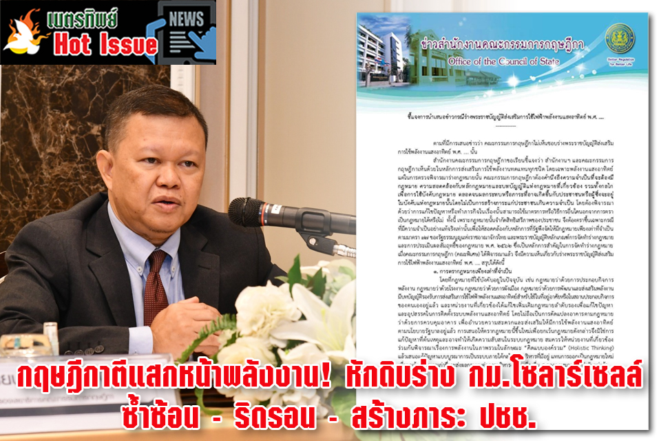 กฤษฎีกาตีแสกหน้าพลังงาน ชี้ร่าง กม.โซลาร์เซลล์ มีเนื้อหาซ้ำซ้อนกฎหมายอื่นที่มีอยู่แล้ว แนะหากพบ กม.ใดเป็นอุปสรรคต่อการส่งเสริมการใช้พลังงานโซลาร์เซลล์ควรเสนอ ครม. บี้หน่วยงานที่เกี่ยวข้องแก้ไข จะเหมาะสมกว่า!