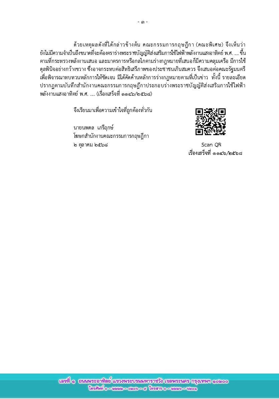 ด้วยเหตุผลดังที่ได้กล่าวข้างต้น คณะกรรมการกฤษฎีกา (คณะพิเศษ) จึงเห็นว่ายังไม่มีความจำเป็นถึงขนาดที่จะต้องตราร่างพระราชบัญญัติส่งเสริมการใช้ไฟฟ้าพลังงานแสงอาทิตย์ พ.ศ. .... ขึ้น ตามที่กระทรวงพลังงานเสนอ และมาตรการหรือกลไกตามร่างกฎหมายที่เสนอก็มีความคลุมเครือ มีการใช้ดุลพินิจอย่างกว้างขวาง ซึ่งอาจกระทบต่อสิทธิเสรีภาพของประชาชนเกินสมควร จึงเสนอต่อคณะรัฐมนตรีเพื่อพิจารณาทบทวนหลักการให้ชัดเจน มิได้คัดค้านหลักการร่างกฎหมายตามที่เป็นข่าว ทั้งนี้ รายละเอียดปรากฏตามบันทึกสำนักงานคณะกรรมการกฤษฎีกาประกอบร่างพระราชบัญญัติส่งเสริมการใช้ไฟฟ้าพลังงานแสงอาทิตย์ พ.ศ…(เรื่องเสร็จที่ ๑๑๔๖/๒๕๖๘)