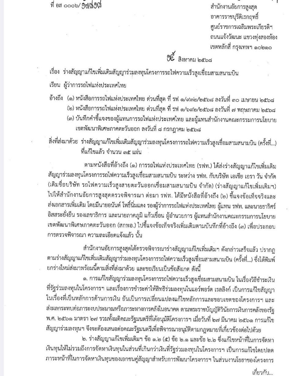 ล่าสุด มีการเปิดเผยถึงร่างสัญญาแก้ไขที่สำนักงานอัยการสูงสุด ทำหนังสือส่งถึงผู้ว่าการรถไฟฯ ลงวันที่ 15 สิงหาคม 2568 แจ้งถึงข้อสังเกตในการตรวจพิจารณาร่างสัญญาแก้ไขเพิ่มเติมสัญญาร่วมลงทุนโครงการรถไฟความเร็วสูงเชื่อมสามสนามบิน ก่อนที่การรถไฟฯ จะตั้งคณะทำงานขึ้นหารือร่วมกับบริษัท เอเชียเอราวัน จำกัด คู่สัญญาเพื่อหาทางออกร่วมกัน โดยข้อสังเกตของสำนักงานอัยการสูงสุดที่ส่งมานั้น สรุปสาระสำคัญได้ดังนี้