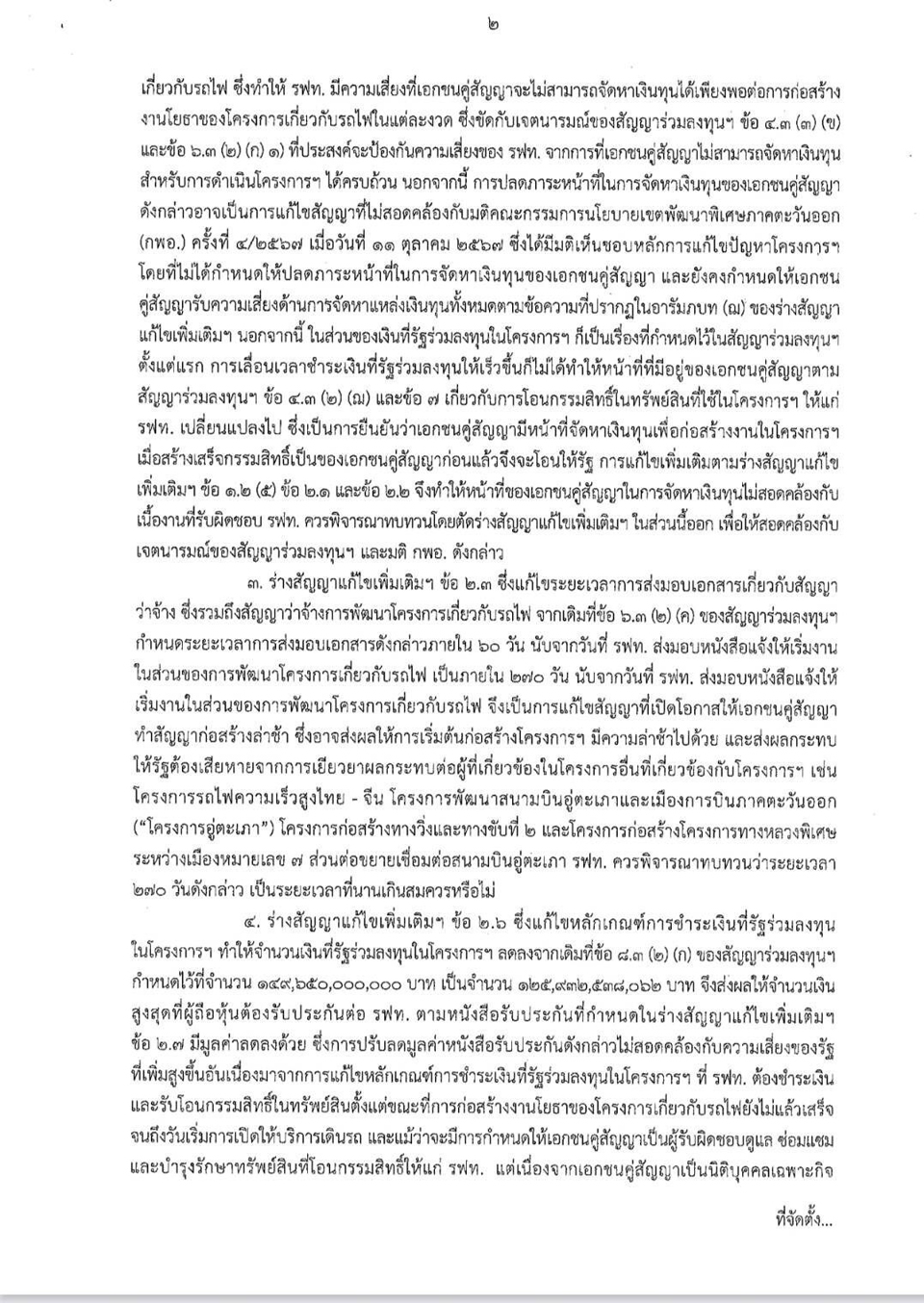 2. การแก้ไขสัญญาที่กำหนดให้หน้าที่ในการจัดหาเงินทุนไม่รวมถึงการจัดหาเงินทุนในส่วนที่เกินกว่าเงินที่รัฐร่วมลงทุนในโครงการฯ เป็นการแก้ไขโดยปลดภาระหน้าที่ในการจัดหาเงินทุนของเอกชนคู่สัญญาในการพัฒนาโครงการฯ ซึ่งทำให้ รฟท. มีความเสี่ยงที่เอกชนคู่สัญญาจะไม่สามารถจัดหาเงินทุนได้เพียงพอต่อการก่อสร้างงานโยธาของโครงการเกี่ยวกับรถไฟในแต่ละงวด ซึ่งขัดกับเจตนารมณ์ของสัญญาร่วมลงทุนฯ