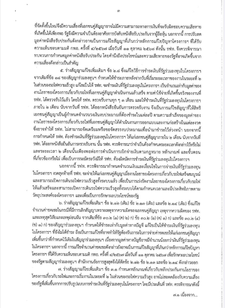 7. การแก้ไขสัญญาโดยกำหนดหลักเกณฑ์เกี่ยวกับหลักประกันงานโยธาของโครงการเกี่ยวกับรถไฟและการเริ่มงานในระยะที่ 2 ในส่วนของรถไฟความเร็วสูง อาจไม่สอดคล้องกับความเสี่ยงของรัฐที่เพิ่มขึ้นจากการปรับรูปแบบการชำระเงินที่รัฐร่วมลงทุนในโครงการฯ จึงควรพิจารณาทบทวนการแก้ไขสัญญาดังกล่าว โดยกำหนดให้มีหลักประกันให้ครอบคลุมความเสี่ยงตามมูลค่าของงานโยธาของโครงการเกี่ยวกับรถไฟ งานระบบรถไฟ และขบวนรถไฟ และกำหนดให้ดำรงมูลค่าของหลักประกันดังกล่าวไว้จนกว่าครบระยะเวลา 2 ปี นับจากวันที่ รฟท. ได้ออกหนังสือรับรองการเริ่มให้บริการเดินรถทั้งระบบ ซึ่งเป็นกำหนดระยะเวลารับผิดในความชำรุดบกพร่องภายหลังการก่อสร้างงานโยธาของโครงการเกี่ยวกับรถไฟ