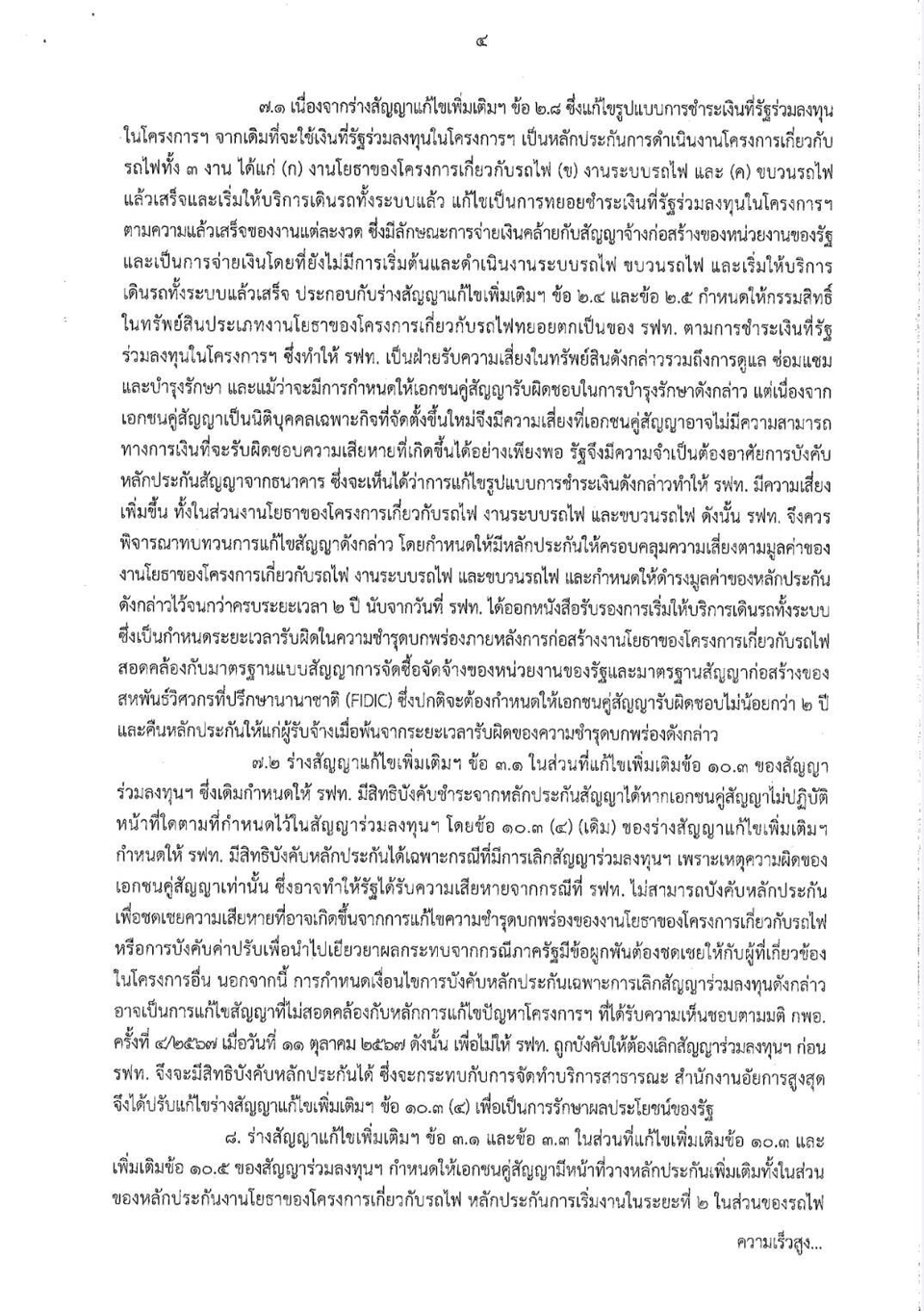 4. การปรับลดมูลค่าหนังสือรับประกันไม่สอดคล้องกับความเสี่ยงของรัฐที่เพิ่มสูงขึ้นอัน เนื่องมาจากการแก้ไขหลักเกณฑ์การชำระเงินที่รัฐร่วมลงทุนในโครงการฯ ที่ รฟท. ต้องชำระเงินและรับโอนกรรมสิทธิ์ในทรัพย์สินตั้งแต่ขณะที่การก่อสร้างงานโยธาของโครงการเกี่ยวกับรถไฟยังไม่แล้วเสร็จจนถึงวันเริ่มการเปิดให้บริการเดินรถ และมีความเสี่ยงที่เอกชนคู่สัญญาอาจไม่มีความสามารถทางการเงินที่จะรับผิดชอบความเสียหายที่เกิดขึ้นได้เพียงพอ รวมทั้งอาจเป็นการแก้ไขสัญญาที่เกินกว่าหลักการแก้ไขปัญหาโครงการฯ ที่ได้รับความเห็นชอบตามมติ กพอ. ครั้งที่ 4/2567 เมื่อวันที่ 11 ตุลาคม 2567 ดังนั้น รฟท. จึงควรพิจารณาทบทวนการกำหนดมูลค่าหนังสือรับประกัน โดยคำนึงถึงประโยชน์และความเสียหายของรัฐที่อาจเกิดขึ้นจาก ความเสี่ยงดังกล่าวเป็นสำคัญ
