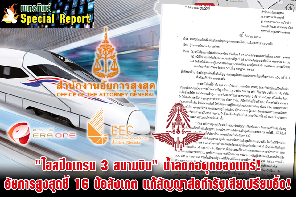 น้ำลดตอผุดของแท้! หลังกระทรวงคมนาคมยุค "ภูมิใจไทยคัมแบ็ค" หักดิบล้มแก้สัมปทานโครงการรถไฟความเร็วสูงเชื่อม 3 สนามบิน ลั่นดานเอกชนจับเสือมือเปล่า เผยข้อสังเกตสำนักงานอัยการสูงสุด ชี้ร่างแก้ไขสัญญาส่อทำรัฐเสียประโยชน์อื้อถึง 16 ข้อ