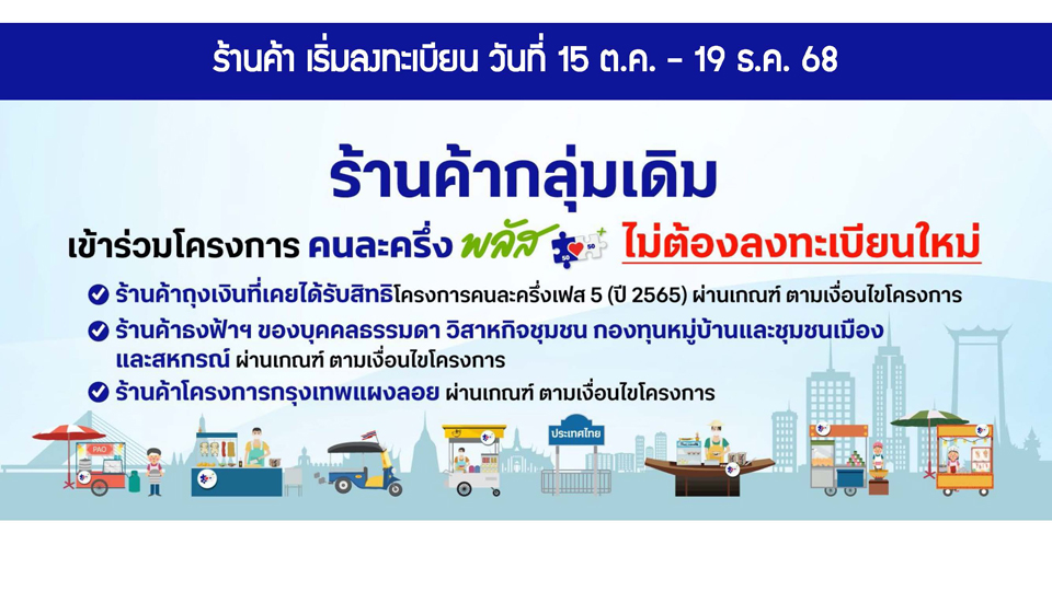 ผู้สื่อข่าวรายงานว่า โครงการคนละครึ่ง พลัส (โครงการฯ) จะมีการเปิดลงทะเบียนผู้ประกอบการร้านค้าในวันพรุ่งนี้เป็นวันแรก (วันพุธที่ 15 ตุลาคม 2568) จนถึงวันที่ 19 ธันวาคม 2568 โดยมีรายละเอียดประเภทร้านค้า และการลงทะเบียนร้านค้า ดังนี้