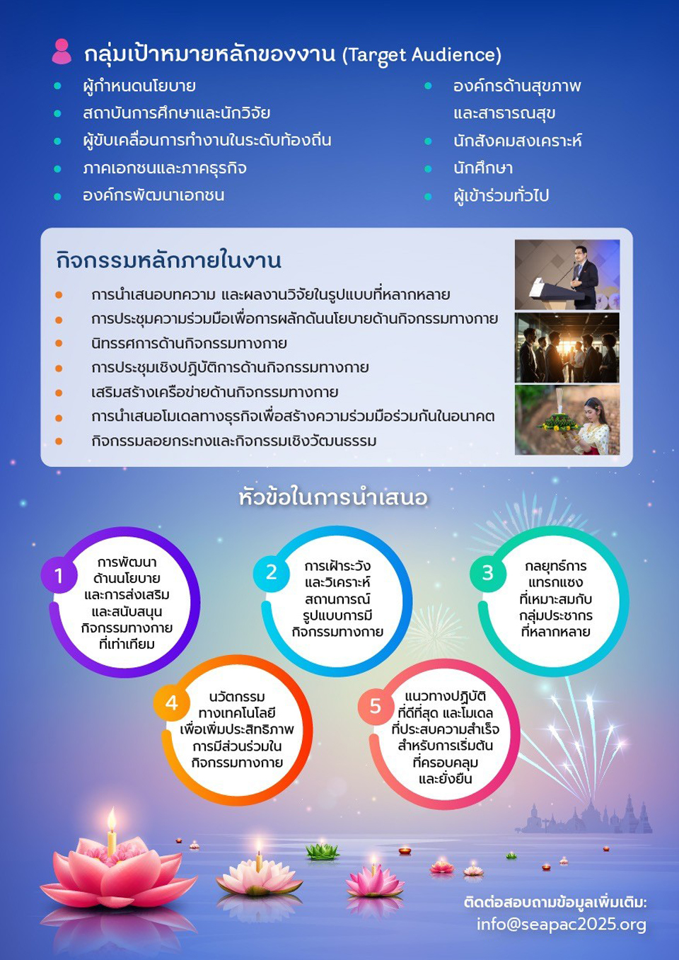 ขณะที่ ศาสตราจารย์เกียรติคุณ ดร.รชตะ รัชตะนาวิน ผู้แทนจากมหาวิทยาลัยมหิดล ย้ำว่า การส่งเสริมกิจกรรมทางกายจะประสบผลสำเร็จ ต้องอาศัยความร่วมมือจากทุกภาคส่วน ทั้งภาครัฐ เอกชน และการเมืองในทุกระดับ เพื่อให้เกิดการปรับเปลี่ยนสภาพแวดล้อมที่เอื้อต่อการเดิน การขี่จักรยาน รวมถึงการสร้างพื้นที่สีเขียวที่ปลอดภัย การจัดระบบขนส่งสาธารณะที่เชื่อมโยงกับ WHO Global Action Plan on Physical Activity (GAPPA) และเป้าหมายการพัฒนาที่ยั่งยืน (SDGs) ของสหประชาชาติ ซึ่งการประชุม SEAPAC 2025 ในครั้งนี้ ถือเป็นจุดเริ่มต้นของการเปลี่ยนแปลงและเป็นเวทีแห่งการสร้างพันธมิตรใหม่ในการขับเคลื่อนระหว่างทุกภาคส่วน สมาชิก 14 ประเทศ ที่จะร่วมกันสร้างการเปลี่ยนแปลงการมีกิจกรรมออกกำลังกาย เพื่อสุขภาพที่ดีขึ้นในประเทศไทยและทั่วโลกต่อไป