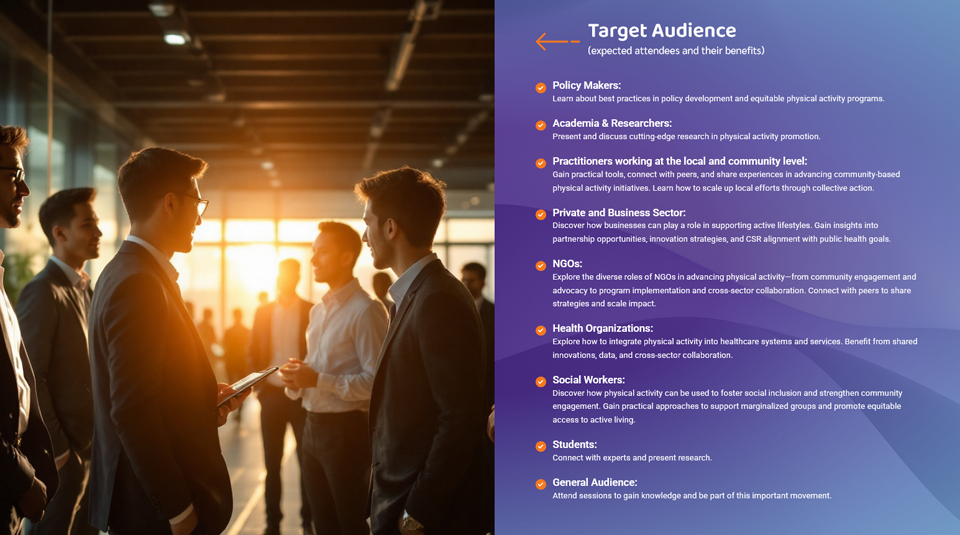 รองอธิบดีกรมอนามัย กล่าวว่า แนวคิดหลักของการประชุม คือ “สุขภาพดี สร้างได้ทุกที่” (The Promotion of National Policies and Plans for Physical Activity) โดยเน้นย้ำว่าการส่งเสริมกิจกรรมทางกาย (Physical Activity) เป็นนโยบายสำคัญเร่งด่วนในการแก้ปัญหาสุขภาพโลก โดยเฉพาะโรคไม่ติดต่อเรื้อรัง (NCDs) เช่น โรคหัวใจ เบาหวาน และมะเร็ง