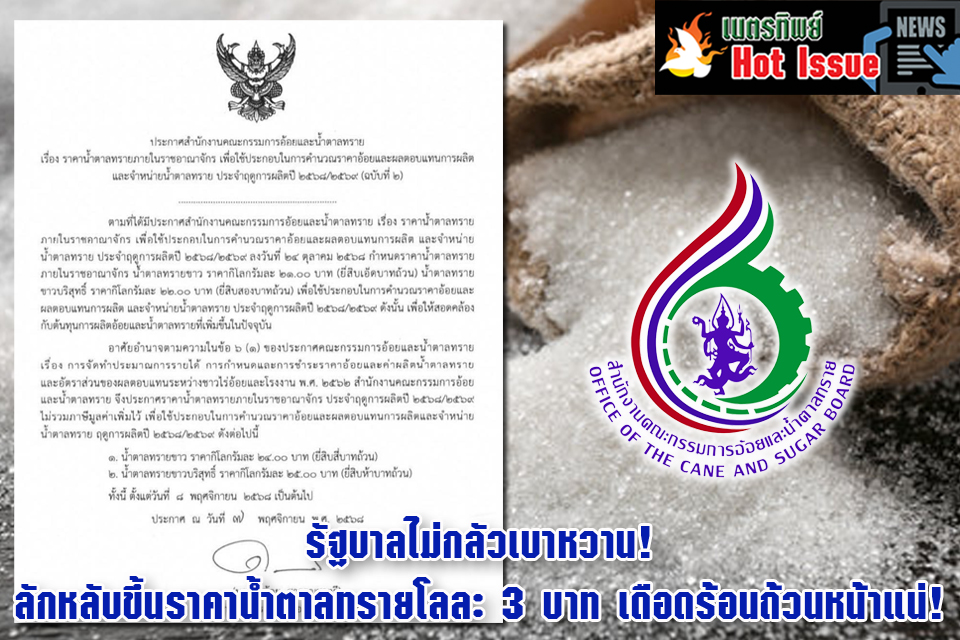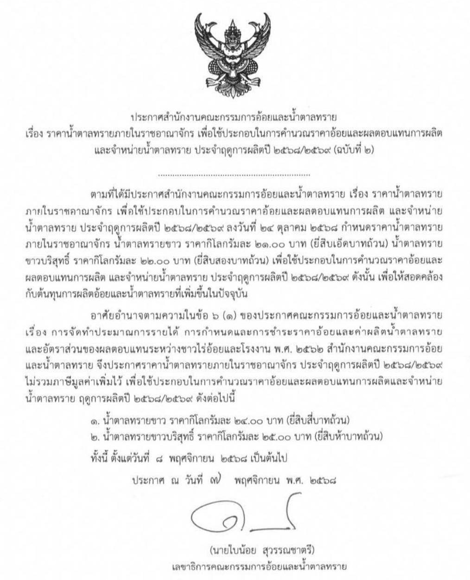 โดยระบุว่า ตามที่ได้มีประกาศสำนักงานคณะกรรมการอ้อยและน้ำตาลทราย เรื่อง ราคาน้ำตาน้ำตาลทรายภายในราชอาณาจักร เพื่อใช้ประกอบในการคำนวณราคาอ้อยและผลตอบแทนการผลิต และจำหน่ายน้ำตาลทราย ประจำฤดูการผลิตปี 2568/2569 ลงวันที่ 24 ตุลาคม 2568 กำหนดราคาน้ำตาลทรายภายในราชอาณาจักร น้ำตาลทรายขาว ราคากิโลกรัมละ 21.00 บาท (ยี่สิบเอ็ดบาทถ้วน)