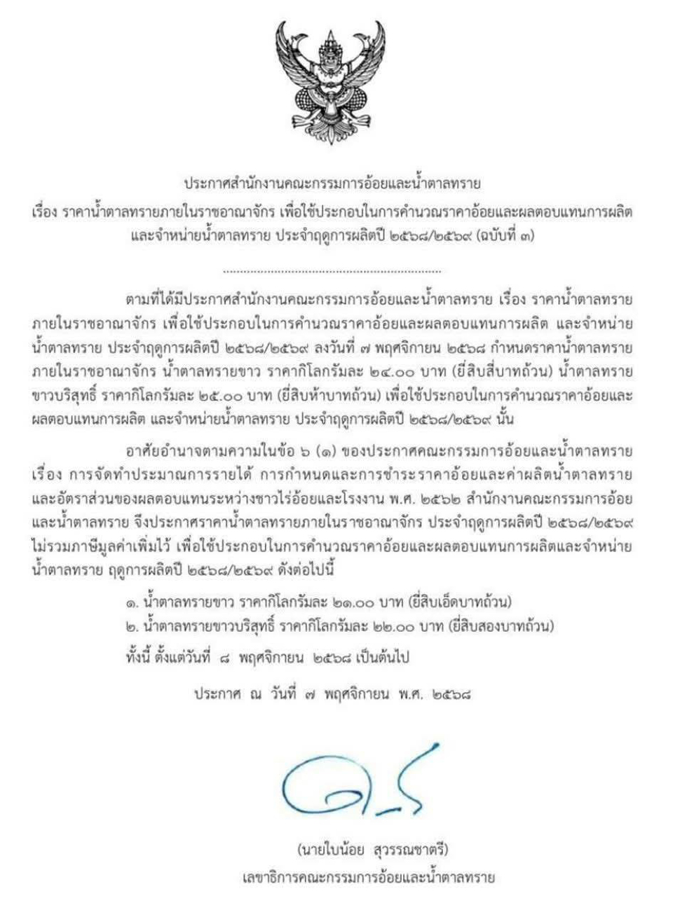 ล่าสุด ผู้สื่อข่าวรายงานว่า เมื่อวันที่ 8 พ.ย.68 หลังจากที่ นายใบน้อย สุวรรณชาตรี เลขาธิการคณะกรรมการอ้อยและน้ำตาลทราย (สอน.) ได้ออกประกาศด่วน เรื่องการปรับราคาน้ำตาลทรายในราชอาณาจักร เพื่อใช้ประกอบในการคำนวณราคาอ้อยและผลตอบแทนการผลิตและจำหน่ายน้ำตาลทราย ประจำฤดูการผลิตปี 2568/2569 โดยขึ้นราคาน้ำตาลทรายขาว เป็นราคากิโลกรัมละ 24 บาท จากเดิมกิโลกรัม 21 บาท และขึ้นราคาน้ำตาลทรายขาวบริสุทธิ์ เป็นราคา กก.ละ 25 บาท จาก กก.ละ 22 บาท มีผลตั้งแต่วันที่ 8 พฤศจิกายน 2568 เพื่อให้เป็นไปตามต้นทุนการผลิต และนำส่วนต่างที่เพิ่มขึ้นมาคำนวณรายได้ให้ชาวไร่อ้อยคิดเป็น 50 บาท ต่อตันอ้อย