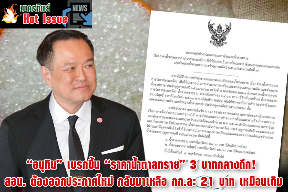 จากกรณีที่สำนักงานคณะกรรมการอ้อยและน้ำตาลทราย (สอน.) ได้ออกประกาศ “ปรับราคาน้ำตาลขึ้น 3 บาทต่อกิโลกรัม แต่ถูกแค่ชั่วข้ามคืน แต่ถูก “อนุทิน ชาญวีรกุล” นายกรัฐมนตรี เบรกจนหัวทิ่ม!