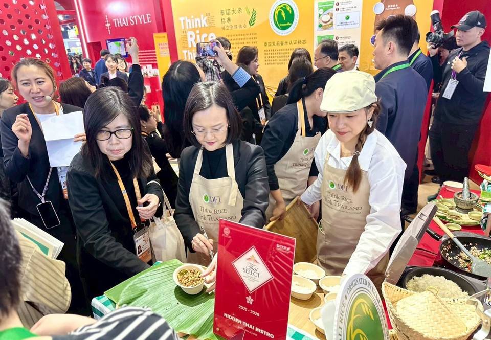 กรมฯ ได้เข้าร่วมงาน CIIE 2025 เป็นปีที่ 3 ติดต่อกัน โดยได้จัดกิจกรรมประชาสัมพันธ์ข้าวไทยบนพื้นที่ Thailand Pavilion ของกรมส่งเสริมการค้าระหว่างประเทศในส่วนของ Country Exhibition ภายใต้แนวคิด “ศาลาไทย” ที่เน้นนำเสนอสินค้าอาหารไทย “Thai SELECT” และความหลากหลายของข้าวไทย สินค้าไลฟ์สไตล์และสุขภาพ–สปา “Thai Style” สินค้าที่ได้รับตราสัญลักษณ์ T Mark และ PM Award และจุดเด่นการท่องเที่ยวของไทย “Thai Experiences” โดยเมื่อวันที่ 6 พฤศจิกายน 2568 กรมส่งเสริมการค้าระหว่างประเทศได้จัดพิธีเปิด Thailand Pavilion ซึ่งได้รับเกียรติจาก ดร. กิริฎา เภาพิจิตร ผู้ช่วยรัฐมนตรีประจำกระทรวงพาณิชย์ เป็นประธาน และยังได้เข้าเยี่ยมชมคูหาของกรมการค้าต่างประเทศ โดยได้ร่วมสาธิตการทำเมนูผัดกะเพราหมูสับทานคู่กับข้าวหอมมะลิไทย แจกให้ผู้เข้าเยี่ยมชมคูหาได้ทดลองชิม ซึ่งได้รับความสนใจเป็นอย่างมาก และต่างชื่นชมในความหอม ความนุ่ม และรสชาติของข้าวหอมมะลิไทย พร้อมแสดงความสนใจซื้อเพื่อนำกลับไปหุงทานที่บ้านและซื้อเป็นของขวัญในช่วงเทศกาลสำคัญของจีน นอกจากนี้ ในคูหาของกรมการค้าต่างประเทศยังได้จัดกิจกรรมสำคัญ ได้แก่ การจัดนิทรรศการและการจัดแสดงตัวอย่างข้าวไทยชนิดต่างๆ การจัดกิจกรรมให้ผู้เข้าเยี่ยมคูหาร่วมตอบคำถามเกี่ยวกับวิธีการเลือกซื้อข้าวหอมมะลิไทยเพื่อรับของที่ระลึก และการสาธิตการปรุงอาหารไทยทานคู่กับข้าวหอมมะลิไทยวันละ 2 รอบ โดยได้รับความสนใจจากผู้นำเข้า ผู้ซื้อและผู้บริโภคชาวจีน รวมทั้งสื่อมวลชนของจีน ตลอดการจัดงาน 6 วัน ประมาณ 5,000 คน