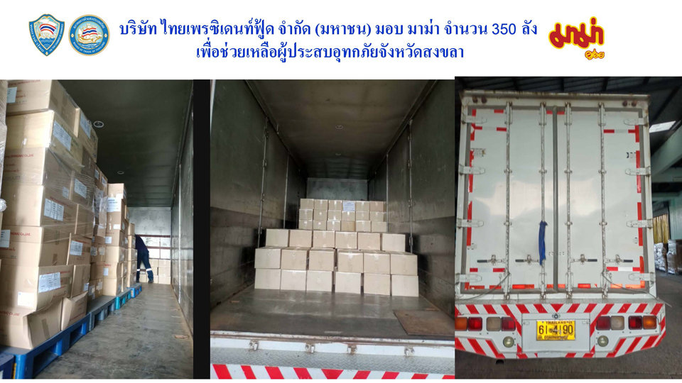 ขณะนี้ ความช่วยเหลือต่างๆ เบื้องต้น อาทิเช่น ปลากระป๋อง 100,000 กระป๋อง จาก Sea Value, มาม่า 350 ลัง, น้ำดื่ม จากทั้ง สิงห์ และช้าง, เตียงกระดาษ จาก SCG, ไข่ไก่ จากหอการค้าจังหวัดนครนายก, อาหารแห้ง, ผ้าขนหนู รวมถึงมีคาราวานความช่วยเหลือจาก Toyota ไปด้วย เป็นต้น ซึ่งจะส่งไปตรงยังจุดกระจายของพื้นที่รับ และศูนย์พักพิง ที่หอการค้าจังหวัดสงขลา ประสานกับในพื้นที่อยู่ นอกเหนือจากนั้นตอนนี้หอการค้าไทยยังเตรียมไปถึงการฟื้นฟูและการซ่อมแซมเมืองโดยได้มีการประสานกับทางขนส่ง คือ โตโยต้า เพื่อขนของและช่วยซ่อมรถยนต์รวมถึง Toshiba ในเรื่องของการซ่อมเครื่องใช้ไฟฟ้า และเอสซีจี ในการดูแลเรื่องอุปกรณ์ซ่อมแซมจริงๆ แล้วยังมีอีกหลายบริษัทที่พร้อมที่จะช่วยเหลือ รวมถึงภาคการเงินที่ตอนนี้ได้มีเรื่องของมาตรการพักหนี้ลดหนี้ขยายเวลาชำระหนี้เพื่อไม่ให้ประชาชนในพื้นที่ประสบปัญหา