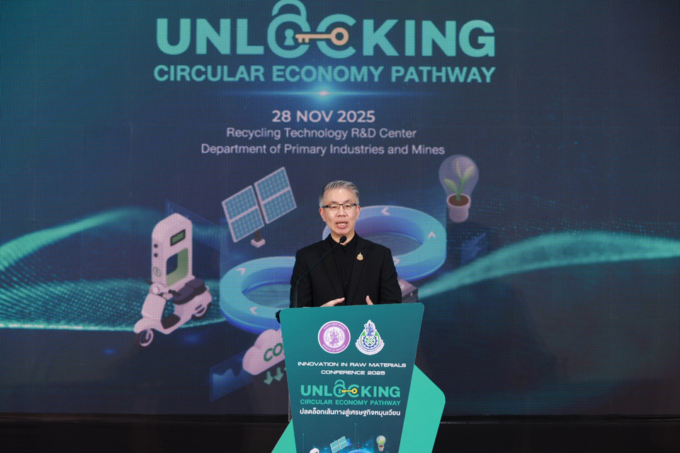 นายณัฐพล รังสิตพล ปลัดกระทรวงอุตสาหกรรม เป็นประธานในพิธีเปิดงานสัมมนาวิชาการ Innovation in Raw Materials Conference 2025 ในหัวข้อ “Unlocking Circular Economy Pathway ปลดล็อกเส้นทางสู่เศรษฐกิจหมุนเวียน” จัดโดยกรมอุตสาหกรรมพื้นฐานและการเหมืองแร่ (กพร.) ณ ศูนย์วิจัยและพัฒนาเทคโนโลยีรีไซเคิล อำเภอพระประแดง จังหวัดสมุทรปราการ เพื่อผลักดันนวัตกรรมและเทคโนโลยีสู่การผลิตวัตถุดิบ (ทดแทน/ขั้นสูง) ในเชิงพาณิชย์ ส่งเสริมให้ผู้ประกอบการมีความรู้ ความเข้าใจ และสามารถนำหลักการเศรษฐกิจหมุนเวียน (Circular Economy) ไปประยุกต์ใช้เพื่อพัฒนาองค์กรควบคู่กับความยั่งยืน พร้อมถ่ายทอดความสำเร็จของนวัตกรรมและเทคโนโลยีวัตถุดิบทดแทนและวัตถุดิบขั้นสูง เดินหน้าเสริมสร้างศักยภาพผู้ประกอบการไทยด้วยเศรษฐกิจหมุนเวียน มุ่งสู่สังคมคาร์บอนต่ำ โดยภายในงานมีการเปิดตัว “ต้นแบบแบตเตอรี่ EV จากการรีไซเคิล” ที่พัฒนาได้สำเร็จเป็นครั้งแรก