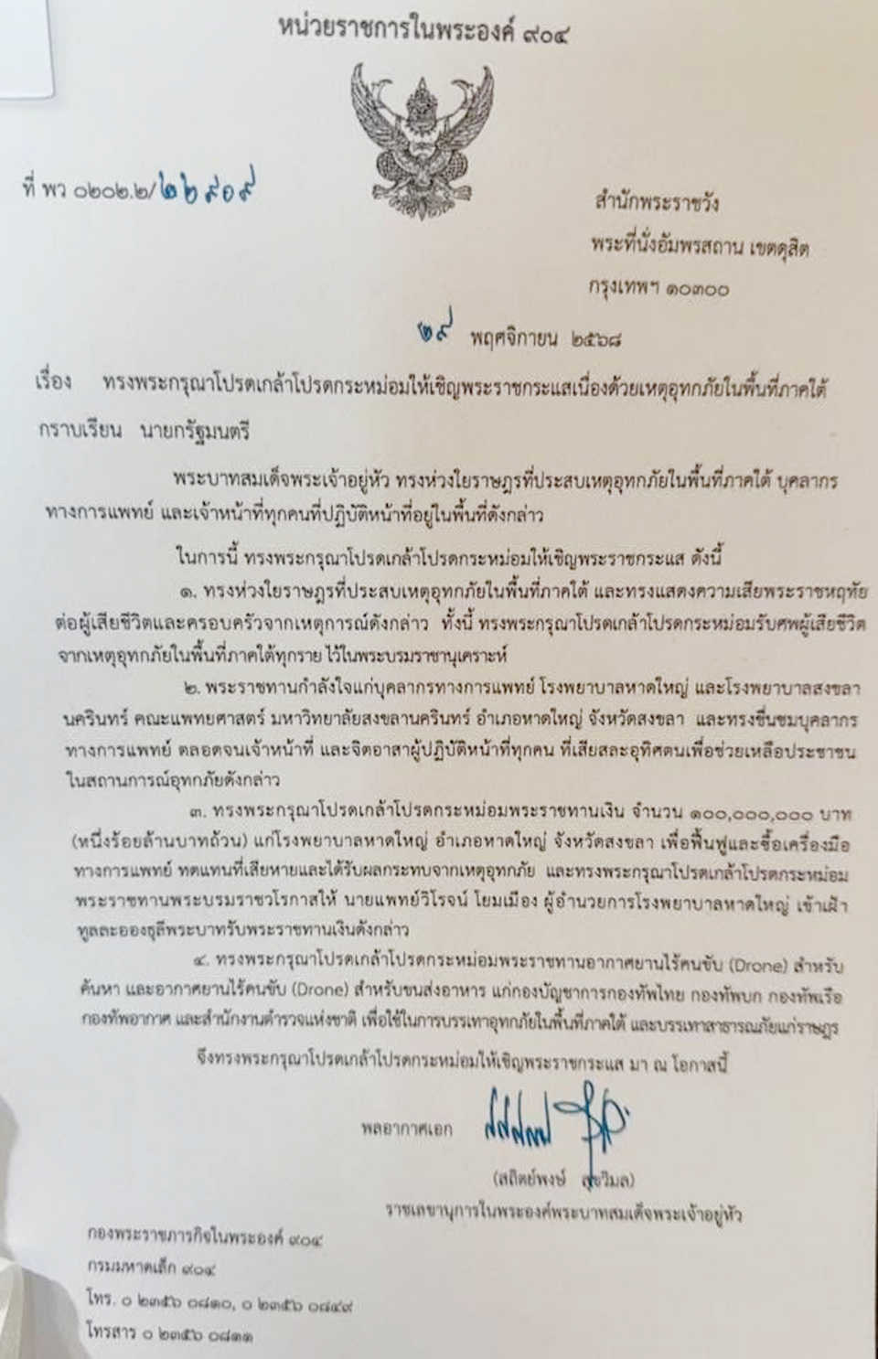 ผู้สื่อข่าวรายงานว่า หน่วยราชการในพระองค์ ๙๐๔ ได้ทำหนังสือที่ พว ๐๒๐๒.๒/๒๒๕๐๙ สำนักพระราชวัง พระที่นั่งอัมพรสถาน เขตดุสิต กรุงเทพฯ ๑๐๓๐๐ ลงวันที่ ๒๔ พฤศจิกายน ๒๕๖๘ เรื่อง ทรงพระกรุณาโปรดเกล้าโปรดกระหม่อมให้เชิญพระราชกระแสเนื่องด้วยเหตุอุทกภัยในพื้นที่ภาคใต้