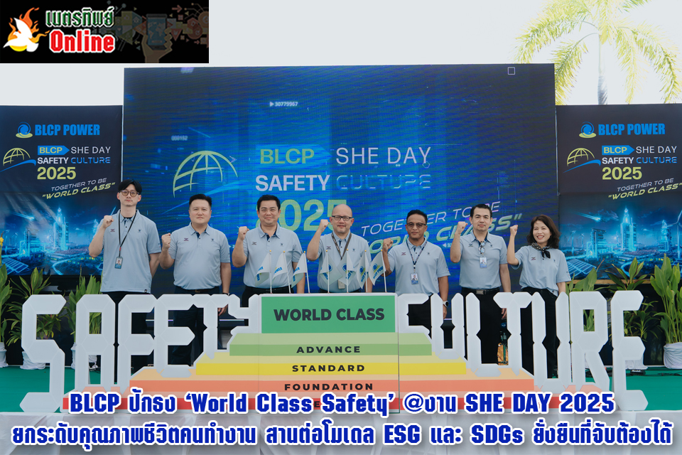 บริษัท บีแอลซีพี เพาเวอร์ จำกัด (BLCP) เดินหน้าตอกย้ำความเป็นผู้นำด้านพลังงานที่ใส่ใจมนุษย์และสิ่งแวดล้อม จัดงานใหญ่ประจำปี “BLCP SHE DAY 2025” ภายใต้แนวคิด “Together to be WORLD CLASS” ประกาศวิสัยทัศน์มุ่งสู่มาตรฐานความปลอดภัยระดับโลก ด้วยวัฒนธรรมความปลอดภัยแบบพึ่งพาอาศัยกัน (Interdependent Safety Culture) พร้อมผนึกกำลังพันธมิตรชั้นนำ ขับเคลื่อนองค์กรด้วยหลัก ESG และ SDGs เพื่อความยั่งยืนทางธุรกิจและคุณภาพชีวิตของบุคลากร