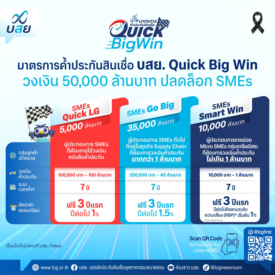 1) บรรษัทประกันสินเชื่ออุตสาหกรรมขนาดย่อม ดำเนินโครงการค้ำประกันสินเชื่อ “SMEs Quick Big Win” มีวงเงินโครงการรวม 50,000 ล้านบาท เพื่อช่วยสร้างความมั่นใจให้แก่สถาบันการเงินในการปล่อยสินเชื่อให้ผู้ประกอบการ SMEs โดยฟรีค่าธรรมเนียม 3 ปีแรก แบ่งเป็น 3 โครงการย่อย ได้แก่ (1) โครงการค้ำประกันสินเชื่อ SMEs Go Big สำหรับผู้ประกอบการ SMEs ทั่วไป (2) โครงการค้ำประกันสินเชื่อ SMEs Smart Win สำหรับผู้ประกอบการรายย่อย (Micro SMEs) และ (3) โครงการค้ำประกันสินเชื่อ SMEs Quick LG สำหรับผู้ประกอบการรับเหมาก่อสร้าง หรือจัดซื้อหรือจัดจ้างของหน่วยงานราชการ รัฐวิสาหกิจ และภาคธุรกิจ รับคำขอค้ำประกันสินเชื่อได้ถึงวันที่ 30 ธันวาคม 2569 นอกจากนี้ ได้ขยายระยะเวลาโครงการค้ำประกันสินเชื่อ Portfolio Guarantee Scheme ระยะที่ 11 ที่ยังคงมีวงเงินเหลืออยู่ ซึ่งจะสิ้นสุดระยะเวลารับคำขอค้ำประกันสินเชื่อวันที่ 30 ธันวาคม 2568 ไปจนถึงวันที่ 30 ธันวาคม 2569