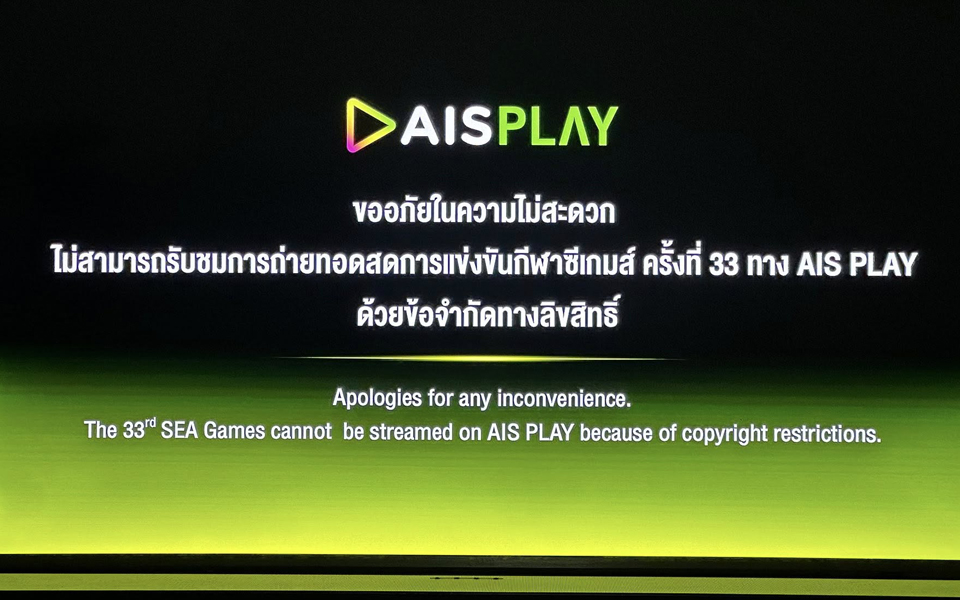 ขออภัยในความไม่สะดวก เนื่องจากการถ่ายทอดสดการแข่งขันกีฬาซีเกมส์ ครั้งที่ 33 มีข้อจำกัดด้านลิขสิทธิ์ ทำให้ไม่สามารถรับชมผ่านช่องทาง AIS PLAY และ AIS PLAYBOX ได้ โดยคุณสามารถรับชมการแข่งขันหรือเป็นกำลังใจให้นักกีฬาไทยได้ผ่านช่องทางอื่นๆ ที่ได้รับอนุญาตอย่างเป็นทางการ… ข้อความที่ปรากฏข้างต้น... คือสิ่งที่คอกีฬาที่รอชมการถ่ายทอดสดมหกรรมกีฬาเพื่อมวลมนุษยชาติทั้งหลายผ่านทีวีดิจิทัลโดยทั่วไปต้องประสบ