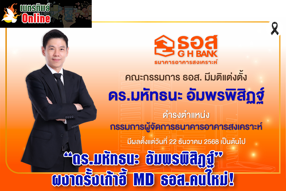 คณะกรรมการธนาคารอาคารสงเคราะห์ (ธอส.) มีมติแต่งตั้ง ดร.มหัทธนะ อัมพรพิสิฏฐ์ ดำรงตำแหน่งกรรมการผู้จัดการธนาคารอาคารสงเคราะห์ โดยความเห็นชอบของรัฐมนตรีว่าการกระทรวงการคลัง และธนาคารแห่งประเทศไทย มีผลตั้งแต่วันที่ 22 ธันวาคม 2568 เป็นต้นไป