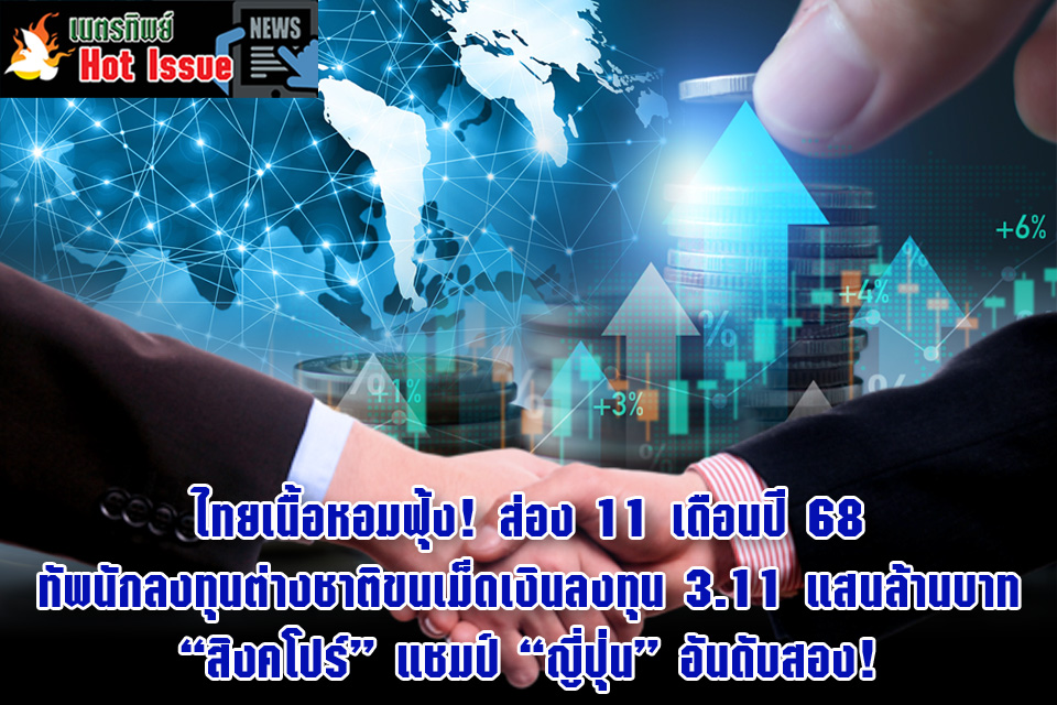 ส่อง 11 เดือนปี 68 ต่างชาติลงทุนในไทยสูงถึง 3.11 แสนล้านบาท เพิ่มขึ้นจาก 11 เดือนปี ‘67 ถึง 9.7 หมื่นล้านบาท หรือ 45% “สิงคโปร์” มีมูลค่าการลงทุนสูงอันดับหนึ่ง 100,265 ล้านบาท ตามด้วย “ญี่ปุ่น” 82,505 ล้านบาท และ “จีน” 33,119 ล้านบาท