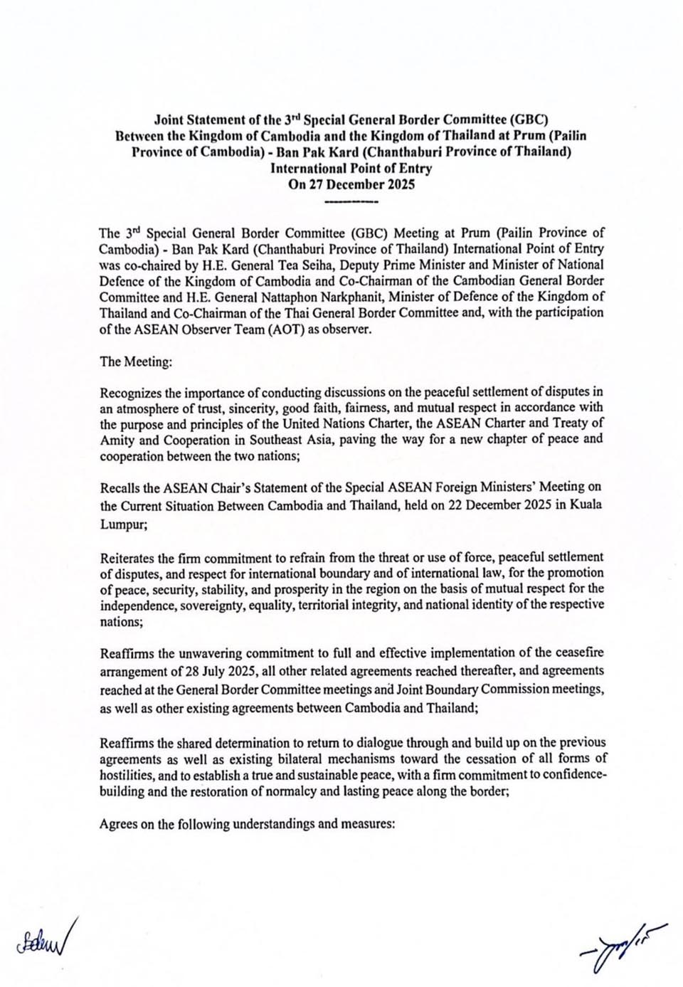 ผู้สื่อข่าวรายงานว่า แถลงการณ์ร่วมการประชุมคณะกรรมการชายแดนทั่วไปพิเศษ (GBC) ครั้งที่ 3 ระหว่าง ราชอาณาจักรกัมพูชา และ ราชอาณาจักรไทย จังหวัดจันทบุรี วันที่ 27 ธันวาคม 2025