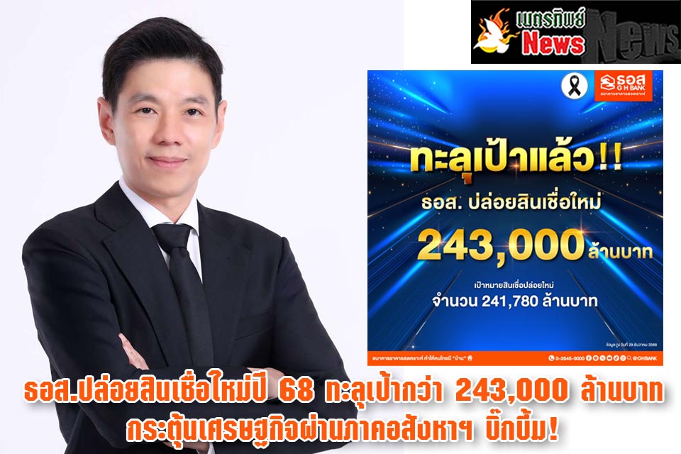 ดร.มหัทธนะ อัมพรพิสิฏฐ์ กรรมการผู้จัดการธนาคารอาคารสงเคราะห์ (ธอส.) เปิดเผยว่า ณ วันที่ 29 ธันวาคม 2568 ธอส. สามารถปล่อยสินเชื่อใหม่จำนวนกว่า 243,000 ล้านบาท สูงกว่าเป้าหมายปี 2568 ที่ตั้งไว้ 241,780 ล้านบาท ซึ่งเป็นส่วนสำคัญในการอัดฉีดเม็ดเงินลงสู่ระบบเศรษฐกิจ ผลักดันภาคอสังหาริมทรัพย์ รวมถึงธุรกิจก่อสร้าง วัสดุอุปกรณ์ และการจ้างงานฟื้นตัวขึ้น โดยในปี 2568 ที่ผ่านมา ธอส. ได้เดินหน้าส่งเสริมให้คนไทยเข้าถึงสินเชื่อบ้านอัตราดอกเบี้ยต่ำมาอย่างต่อเนื่อง และในปี 2569 ธอส. พร้อมเดินหน้าดำเนินการตามนโยบายรัฐบาลและกระทรวงการคลัง ในการช่วยเหลือลูกค้าและประชาชน โดยเฉพาะผู้มีรายได้น้อยและปานกลางให้มีที่อยู่อาศัยเป็นของตนเอง