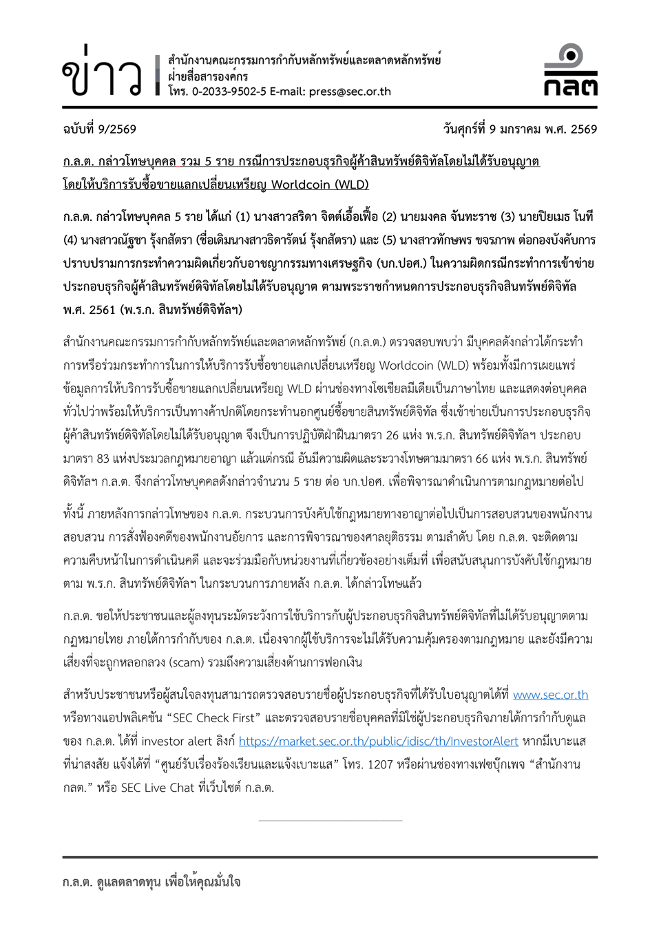 ก.ล.ต. กล่าวโทษบุคคล รวม 5 ราย กรณีการประกอบธุรกิจผู้ค้าสินทรัพย์ดิจิทัลโดยไม่ได้รับอนุญาต โดยให้บริการรับซื้อขายแลกเปลี่ยนเหรียญ Worldcoin (WLD)