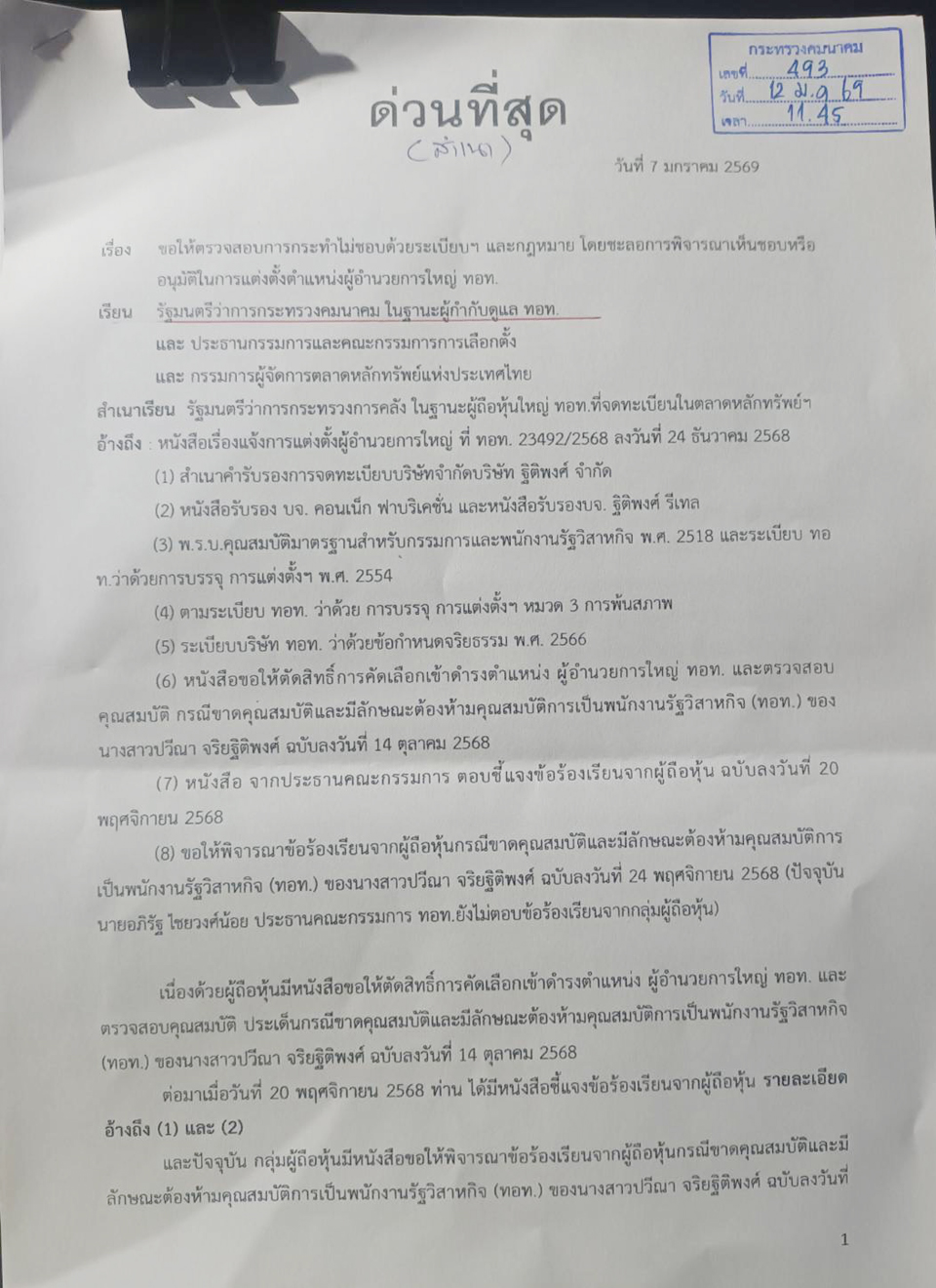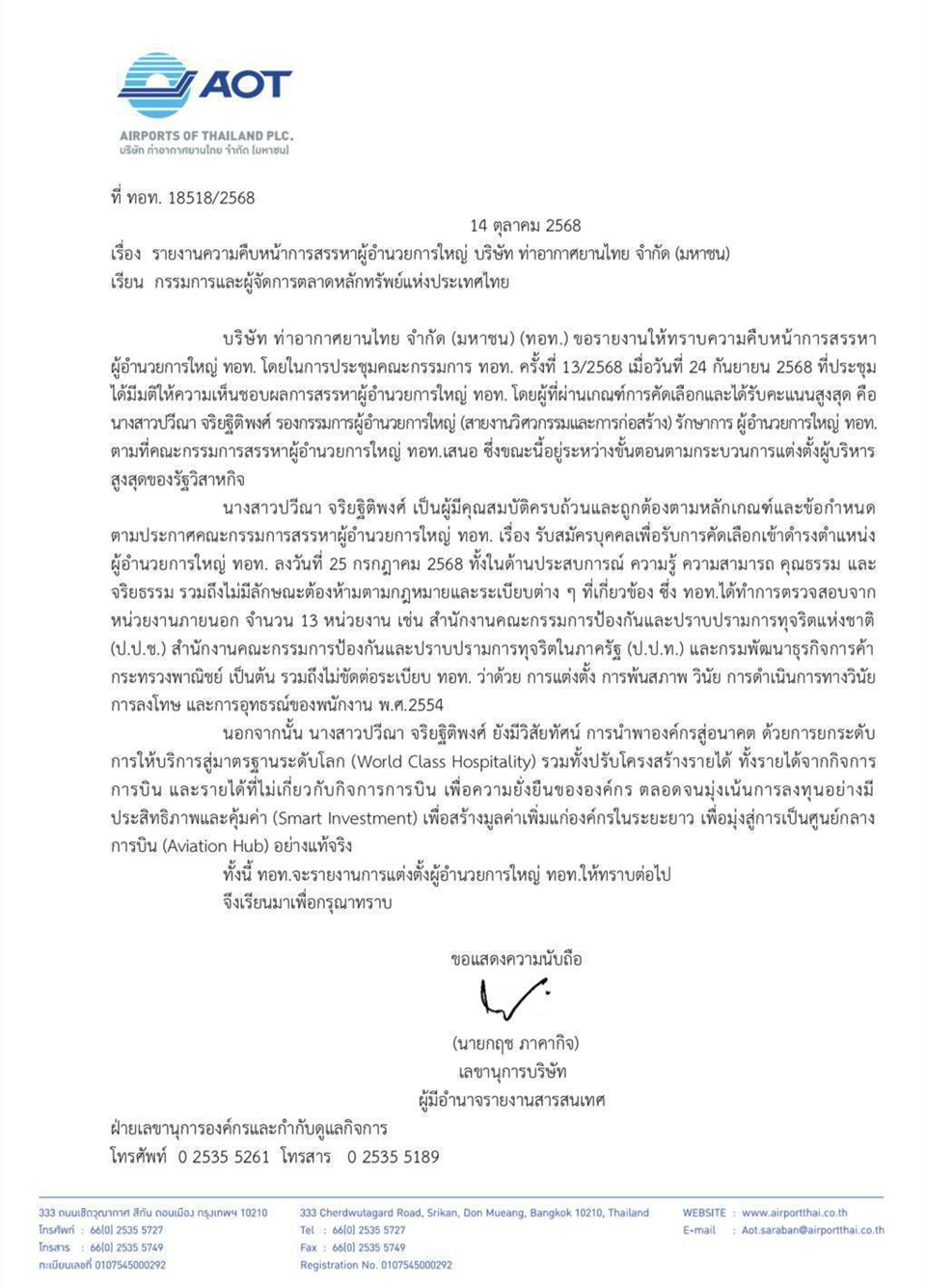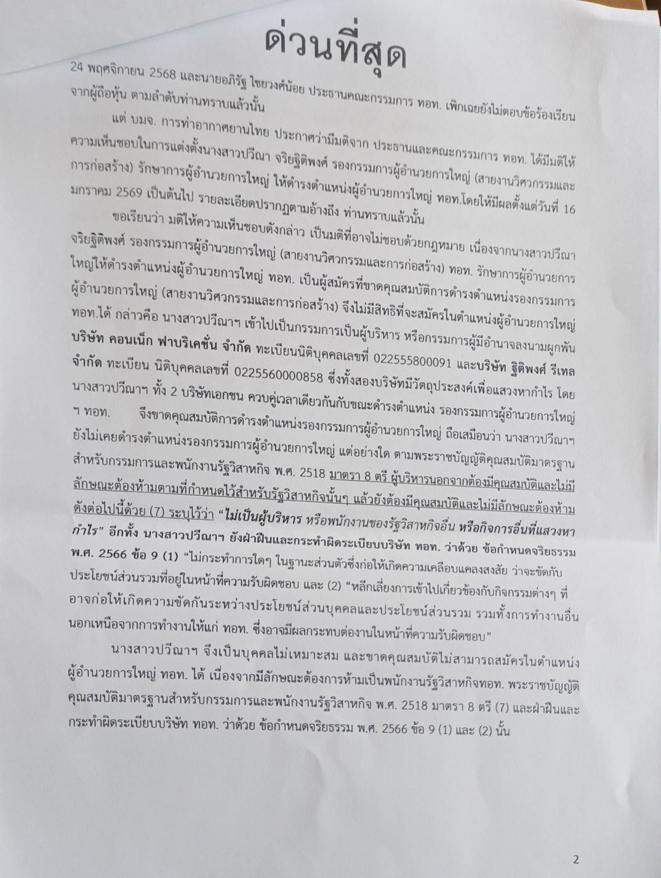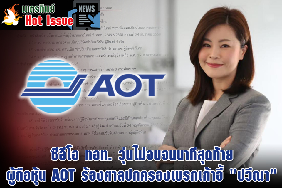 เส้นทางสู่เก้าอี้ผู้อำนวยการใหญ่บริษัทท่าอากาศยานไทย จำกัด (มหาชน) หรือ ทอท. ของ "น.ส.ปวีณา จริยฐิติพงศ์" ยังคงเต็มไปด้วยข้อครหาและข้อร้องเรียนจนถึงนาทีสุดท้าย แม้เมื่อวันที่ 24 ธันวาคม 2568 เลขานุการบริษัท ทอท. จะมีหนังสือแจ้งไปยังตลาดหลักทรัพย์แห่งประเทศไทย (ตลท.) ว่า ที่ประชุมคณะกรรมการ (บอร์ด)ทอท. มีมติเห็นชอบผลการสรรหาและแต่งตั้งนางสาวปวีณา เป็นผู้อำนวยการใหญ่แล้ว โดยให้เริ่มงานในตำแหน่งตั้งแต่วันที่ 16 มกราคม 2569 เป็นต้นไป