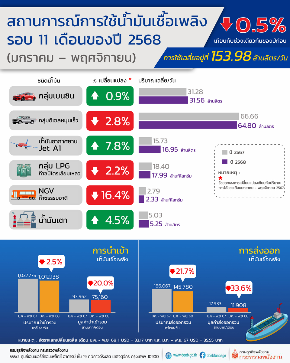 นายสราวุธ แก้วตาทิพย์ อธิบดีกรมธุรกิจพลังงาน เผยภาพรวมการใช้น้ำมันเชื้อเพลิง ในช่วงเดือนมกราคม - พฤศจิกายน 2568 มีปริมาณอยู่ที่ 153.98 ล้านลิตร/วัน ลดลงร้อยละ 0.5 เมื่อเทียบกับช่วงเดียวกันของปีก่อน โดยก๊าซธรรมชาติสำหรับยานยนต์ (NGV) มีปริมาณการใช้ลดลงสูงสุด ที่ร้อยละ 16.4 ตามด้วยก๊าซปิโตรเลียมเหลว (LPG) ลดลงร้อยละ 2.2 และน้ำมันดีเซลหมุนเร็วลดลงร้อยละ 2.8 ขณะที่น้ำมันอากาศยานเชิงพาณิชย์ (Jet A1) มีปริมาณการใช้เพิ่มขึ้นร้อยละ 7.8 การใช้น้ำมันเตาเพิ่มขึ้นร้อยละ 4.5 และกลุ่มเบนซินเพิ่มขึ้นร้อยละ 0.9 โดยมีรายละเอียดปริมาณการใช้น้ำมันเชื้อเพลิงแต่ละชนิดเมื่อเทียบกับช่วงเวลาเดียวกันของปีก่อน ดังนี้