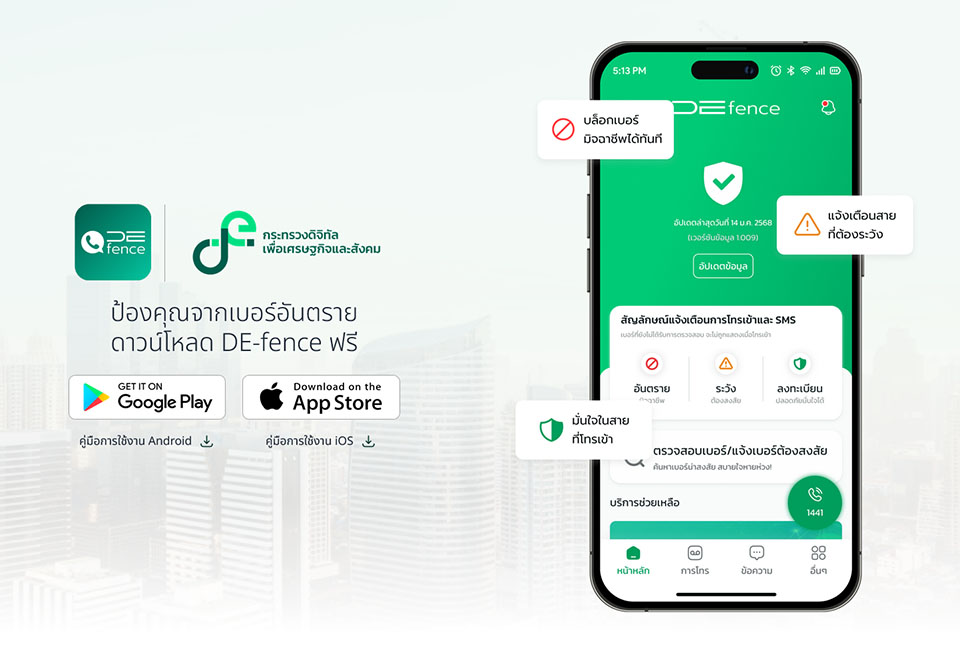 DE เปิดตัวแพลตฟอร์ม “DE-FENCE” อย่างเป็นทางการแล้ววันนี้ โหลดใช้บริการฟรี "กัน-ก่อน-ลวง" หวังสกัดกั้นและตัดวงจรมิจฉาชีพจากการโทรและส่ง SMS