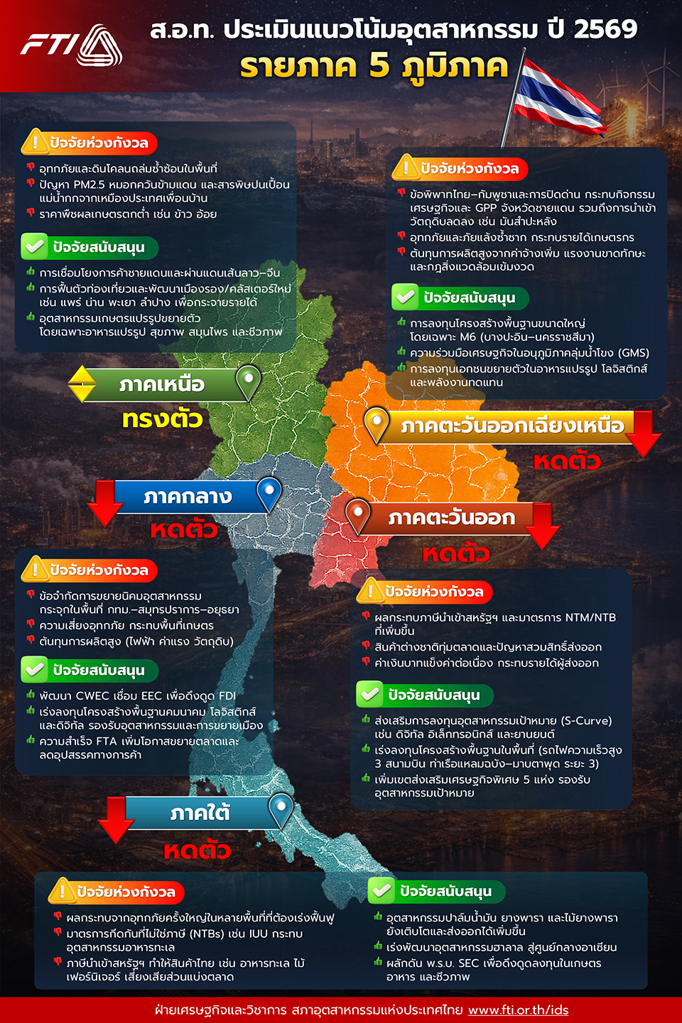 สำหรับแนวโน้มอุตสาหกรรมในระดับภูมิภาค พบว่า มีเพียงอุตสาหกรรมในภาคเหนือที่คาดว่าจะมีแนวโน้มทรงตัว ขณะที่อุตสาหกรรมในภาคตะวันออกเฉียงเหนือ ภาคตะวันออก ภาคกลาง และภาคใต้ คาดว่าจะมีแนวโน้มหดตัวลงเมื่อเทียบกับปีที่ผ่านมา สะท้อนถึงความกังวลต่อปัจจัยทางเศรษฐกิจในปีหน้าที่คาดว่าจะยังมีความผันผวนและมีความไม่แน่นอนจากปัจจัยหลายด้าน ทั้งนี้ ปัจจัยที่คาดว่าจะส่งผลต่อภาคอุตสาหกรรมไทยในปี 2569 สามารถแบ่งออกเป็นปัจจัยสนับสนุนและปัจจัยห่วงกังวลทั้งในและต่างประเทศ