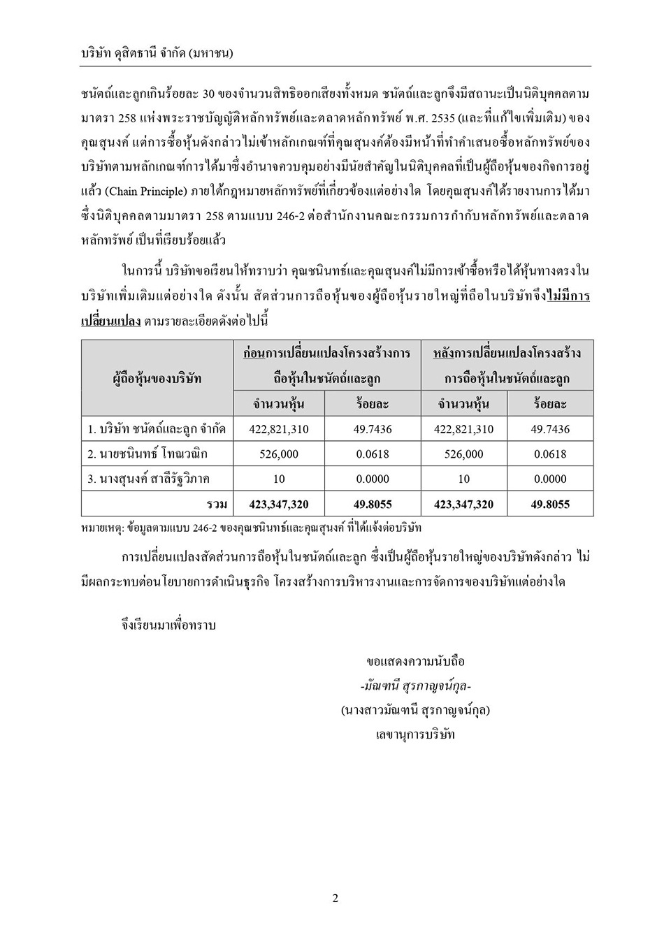 จึงเรียนมาเพื่อทราบ และขอขอบพระคุณในความห่วงใย และความปรารถนาดีของทุกท่านที่มีต่อข้าพเจ้า และบริษัท ดุสิตธานี จำกัด (มหาชน) มา ณ ที่นี้