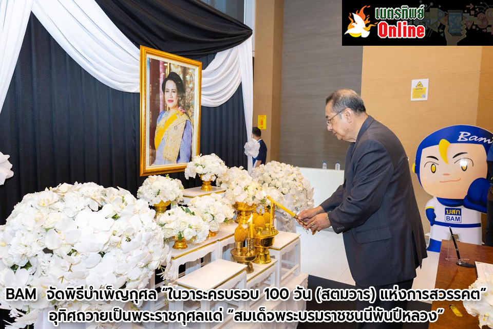นายวสันต์ เทียนหอม กรรมการบริษัท ให้เกียรติเป็นประธานในพิธี พร้อมด้วย ดร.รักษ์ วรกิจโภคาทร ประธานเจ้าหน้าที่บริหาร คณะผู้บริหารและพนักงาน บริษัทบริหารสินทรัพย์ กรุงเทพพาณิชย์ จำกัด (มหาชน) (BAM) ร่วมพิธีบำเพ็ญกุศล ทำบุญตักบาตรพระสงฆ์ จำนวน 10 รูป “ในวาระครบรอบ 100 วัน (สตมวาร) แห่งการสวรรคต” เพื่ออุทิศถวายเป็นพระราชกุศลแด่สมเด็จพระนางเจ้าสิริกิติ์ พระบรมราชินีนาถ พระบรมราชชนนีพันปีหลวง