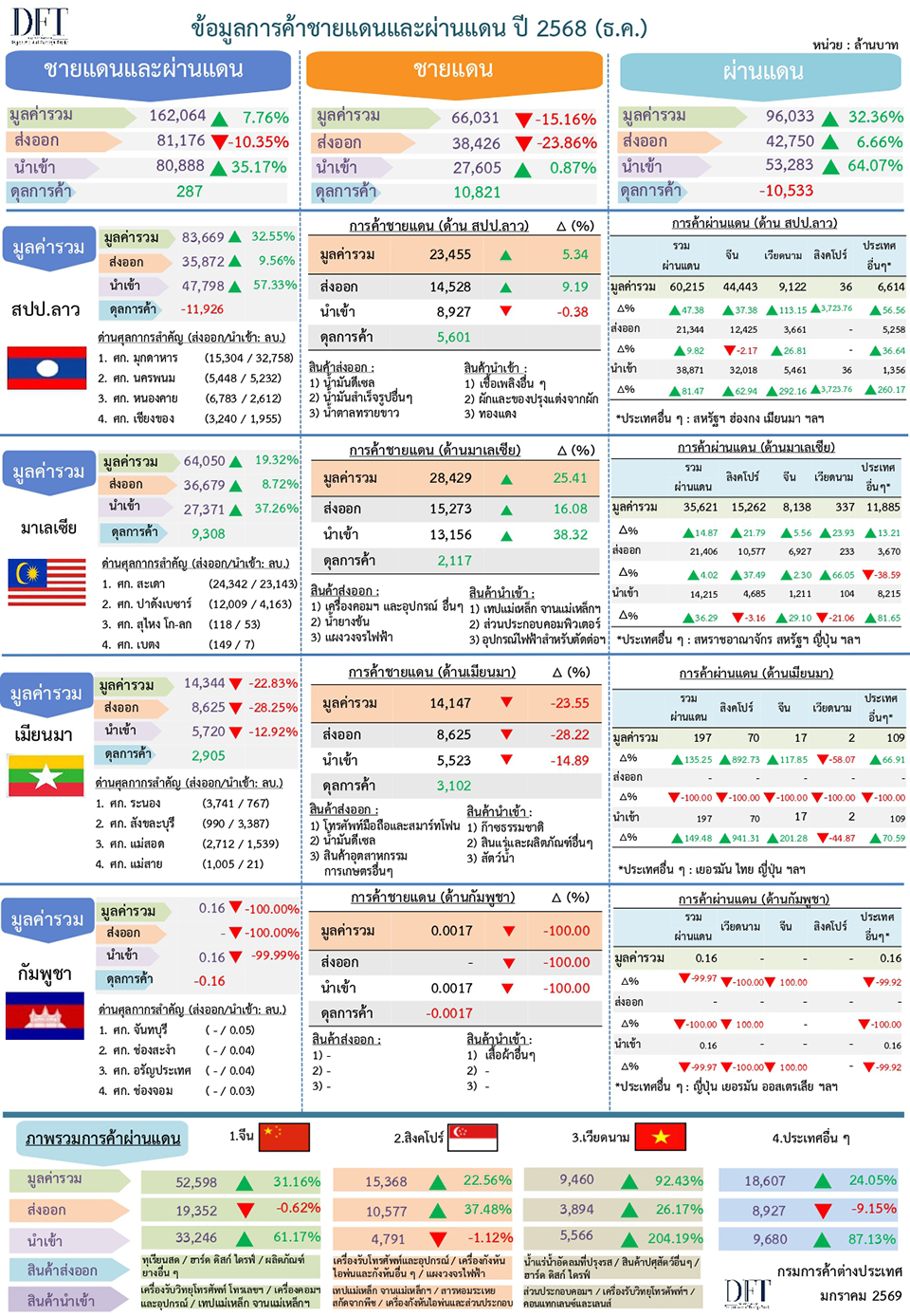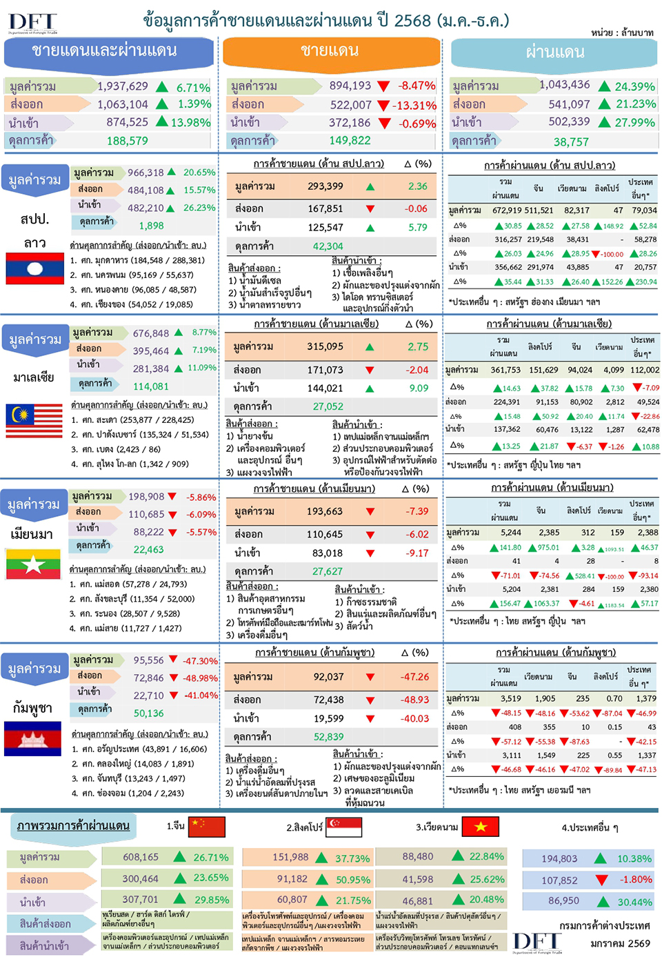 อธิบดีกรมการค้าต่างประเทศ กล่าวว่า ในปี 2568 การค้าชายแดนกับประเทศเพื่อนบ้านเผชิญความท้าทายอย่างยิ่งจากสถานการณ์ความขัดแย้งชายแดนไทย – กัมพูชา ทำให้ต้องปิดจุดผ่านแดนและการค้าหดตัวอย่างมาก รวมถึงด้านเมียนมาจากความไม่สงบในประเทศและการออกมาตรการเข้มงวดควบคุมการนำเข้าสินค้าจากชายแดนไทยเข้าเมียนมา ทำให้การค้าชายแดนชะลอตัวตลอดช่วงครึ่งปีหลัง อย่างไรก็ตาม การค้าผ่านแดนในปีนี้ขยายตัวสูงมากถึง 24.4% มีมูลค่ารวมกว่า 1.04 ล้านล้านบาท สูงที่สุดเป็นประวัติการณ์