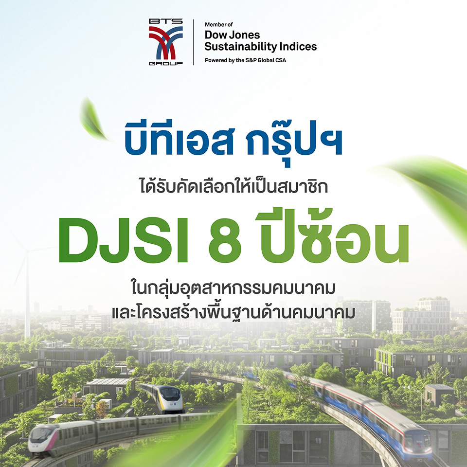บริษัท บีทีเอส กรุ๊ป โฮลดิ้งส์ จำกัด (มหาชน) หรือ บีทีเอส กรุ๊ปฯ ได้รับคัดเลือกให้เป็นสมาชิก ดัชนีความยั่งยืนดาวโจนส์ (Dow Jones Sustainability Indices: DJSI) ในกลุ่มตลาดเกิดใหม่ (Emerging Markets) ต่อเนื่องเป็นปีที่ 8 สะท้อนถึงความมุ่งมั่นในการดำเนินธุรกิจตามแนวทางการพัฒนาอย่างยั่งยืนอย่างต่อเนื่อง และเป็นรูปธรรม นอกจากนี้ บริษัทฯ ได้รับการจัดอันดับอยู่ในกลุ่ม Top 10% จากการประเมิน S&P Global Corporate Sustainability Assessment (CSA) และได้รับการคัดเลือกให้อยู่ในรายงานของ S&P Sustainability Yearbook ประจำปี 2569 ต่อเนื่องเป็นปีที่ 8 ซึ่งเป็นรายงานที่รวบรวมองค์กรชั้นนำจากทั่วโลกที่มีผลการดำเนินงานตามกรอบการพัฒนาธุรกิจอย่างยั่งยืนในด้านสิ่งแวดล้อม สังคม และธรรมาภิบาล (ESG) ในระดับโดดเด่น