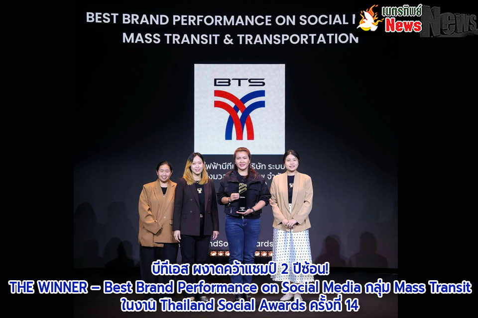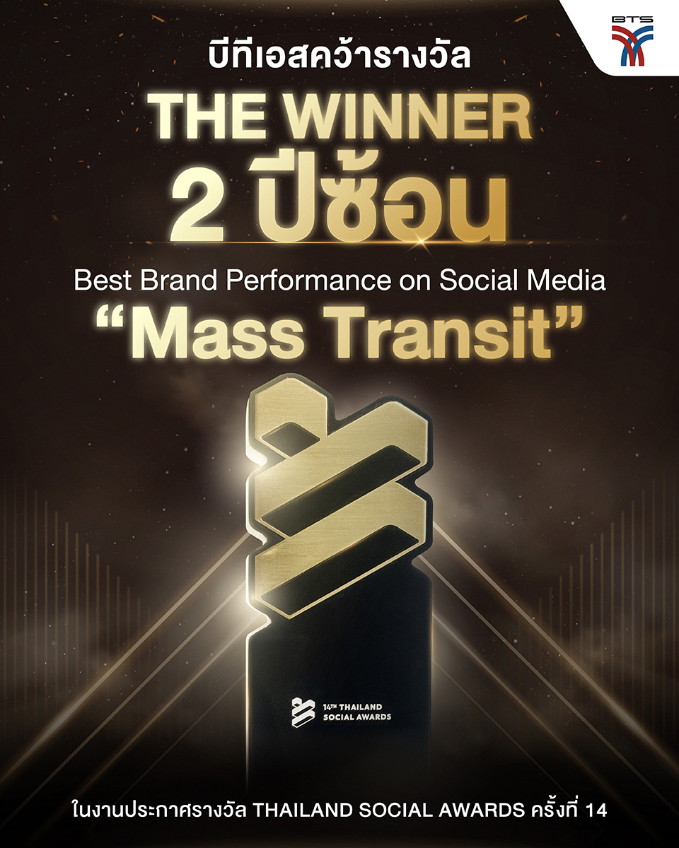 บริษัท ระบบขนส่งมวลชนกรุงเทพ จำกัด (มหาชน) ผู้ให้บริการรถไฟฟ้าบีทีเอส ตอกย้ำความเป็นผู้นำในการให้บริการรถไฟฟ้าสายแรกของประเทศไทย และเป็นระบบขนส่งมวลชนที่ดีที่สุด คว้ารางวัล THE WINNER – Best Brand Performance on Social Media กลุ่ม Mass Transit แบรนด์ที่ทำผลงานยอดเยี่ยมบนโซเชียลมีเดีย กลุ่มธุรกิจขนส่งสาธารณะ ในงานประกาศรางวัล Thailand Social Awards ครั้งที่ 14 จัดโดยบริษัท ไวซ์ไซท์ (ประเทศไทย) จำกัด ผู้ผลิต และพัฒนาซอฟต์แวร์ด้านการวิเคราะห์ข้อมูลตลาด โดยมี นางสาวนริศรา ศรีสันต์ ที่ปรึกษา บริษัท ระบบขนส่งมวลชนกรุงเทพ จำกัด (มหาชน) รับมอบรางวัล ณ ทรู ไอคอน ฮอลล์ ชั้น 7 ไอคอนสยาม