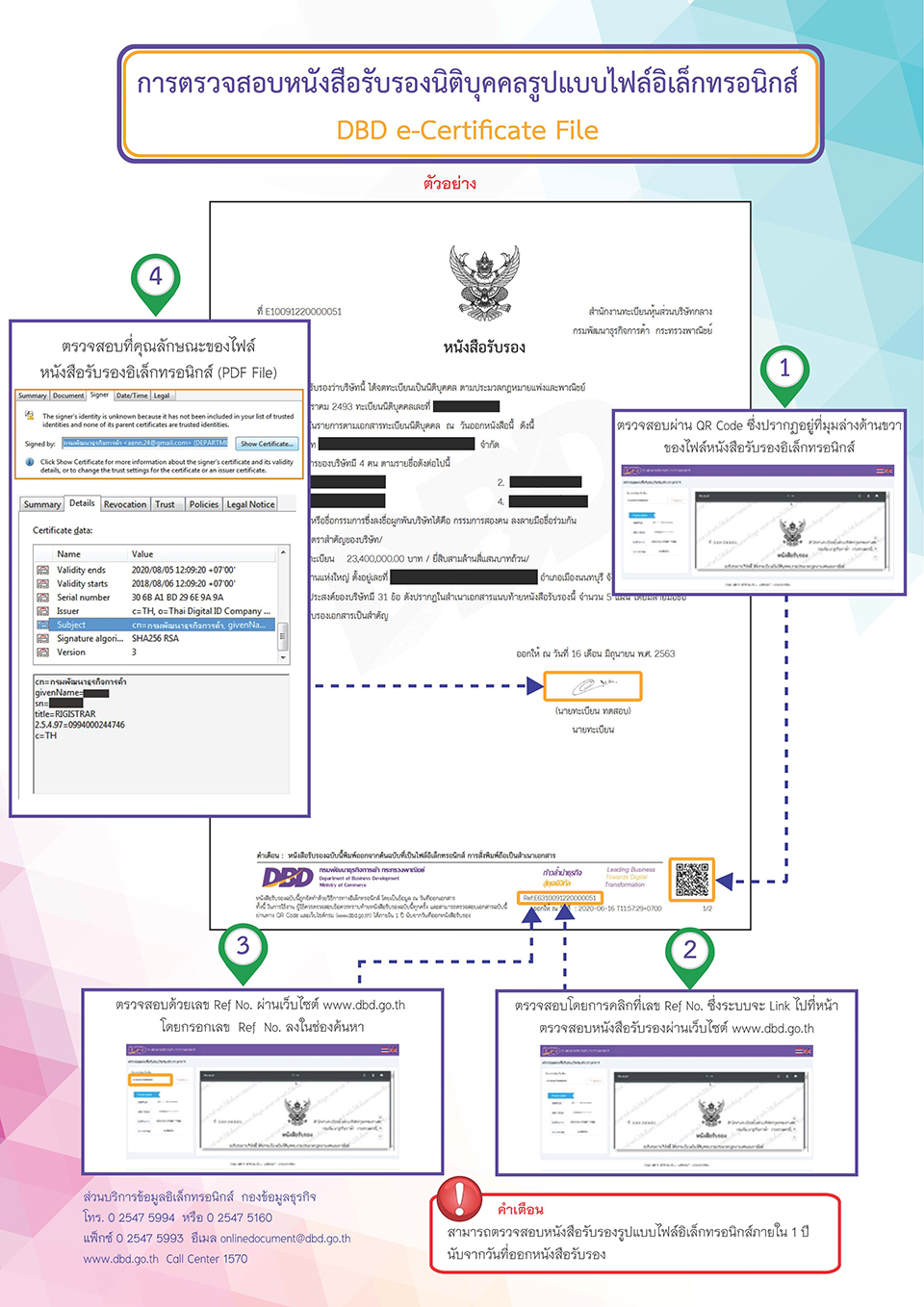 วิธีที่ 3 กรณีหนังสือรับรองรูปแบบไฟล์อิเล็กทรอนิกส์ มีวิธีตรวจสอบเพิ่มเติม คือ สามารถคลิก Ref.No. ที่อยู่ด้านล่างของหนังสือรับรอง โดยระบบจะเชื่อมโยงอัตโนมัติไปยังหน้าตรวจสอบหนังสือรับรองของกรมพัฒนาธุรกิจการค้าผ่านเว็บไซต์ www.dbd.go.th และจะต้องปรากฏข้อมูลเช่นเดียวกับวิธีที่ 2 หรือเมื่อคลิกที่ลายเซ็นของนายทะเบียนจะปรากฏหน้าคุณลักษณะของไฟล์หนังสือรับรองอิเล็กทรอนิกส์ (PDF File) ทั้งนี้ ขึ้นอยู่กับเวอร์ชันของโปรแกรมของประชาชนที่เปิดใช้งานไฟล์ดังกล่าวด้วย และ วิธีที่ 4 สังเกตข้อความตรง ‘ข้อควรทราบ’ ที่อยู่ด้านล่างของหนังสือรับรองนิติบุคคลเพิ่มเติมด้วย เช่น นิติบุคคลรายนั้นไม่มีที่ตั้งตามที่จดทะเบียนไว้ หรือนิติบุคคลขาดการส่งงบการเงินหรือไม่ ซึ่งข้อความเหล่านี้จะช่วยให้ประชาชนเพิ่มความระมัดระวังและใช้ประกอบการตัดสินใจในการร่วมดำเนินธุรกิจ รวมถึงลดความเสี่ยงจากการถูกหลอกลวงจากมิจฉาชีพที่อาจเกิดขึ้นในอนาคตได้