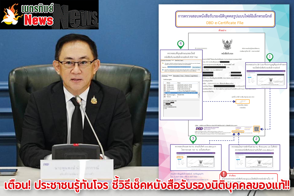 กรมพัฒนาธุรกิจการค้า เตือนประชาชนรู้ทันมิจฉาชีพ เผยเทคนิคเช็คหนังสือรับรองนิติบุคคลของแท้ด้วยตนเอง ป้องกันการตกเป็นเหยื่อ ผ่านการสังเกต 4 วิธี คือ (1) สแกน QR Code ที่อยู่ด้านล่างขวาของหนังสือรับรองจะต้องปรากฏภาพหนังสือรับรองที่มีข้อมูลตรงกัน (2) ตรวจสอบ Ref.No. ในหนังสือรับรองผ่านเว็บไซต์กรมพัฒนาธุรกิจการค้าจะปรากฏรายละเอียดและภาพหนังสือรับรองซึ่งข้อมูลต้องตรงกัน (3) กรณีเป็นหนังสือรับรองแบบไฟล์อิเล็กทรอนิกส์สามารถคลิก Ref.No. ตรงด้านล่างหนังสือรับรองหรือคลิกที่ลายเซ็นนายทะเบียนที่อยู่ด้านล่างหนังสือรับรองจะปรากฏรายละเอียดและภาพหนังสือรับรอง (4) สังเกตข้อควรทราบที่ท้ายหนังสือรับรองก่อนตัดสินใจทำธุรกรรมหรือลงทุนใดๆ กับนิติบุคคลนั้น ทั้งนี้ ระยะเวลาของหนังสือรับรองที่กรมฯ ออกให้ ‘ไม่มีวันหมดอายุ’ ขึ้นอยู่กับข้อกำหนดของหน่วยงานปลายทางที่นำเอกสารไปใช้
