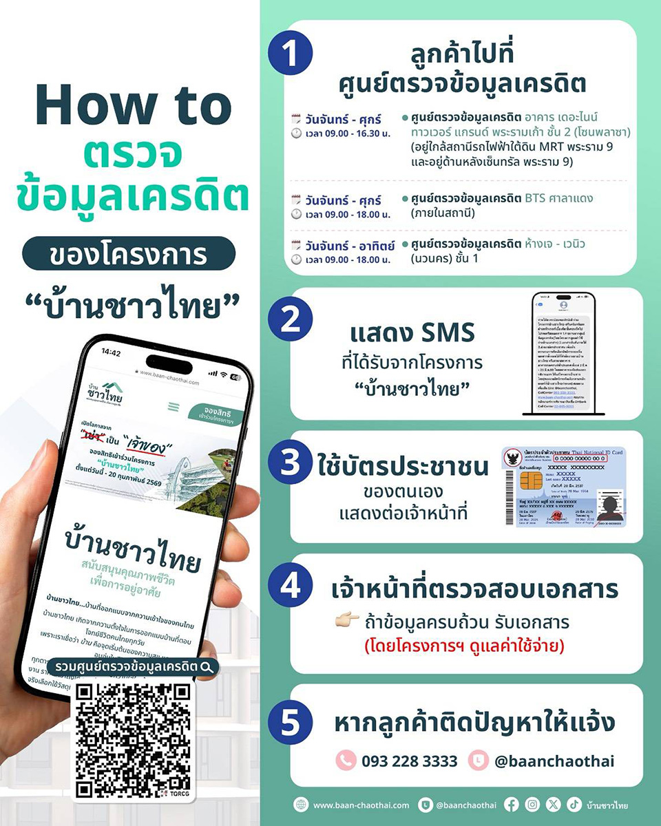 เมื่อผู้ลงทะเบียนจองสิทธิฯ ได้รับเอกสารรายงานข้อมูลเครดิตเรียบร้อยแล้วขอให้ผู้ลงทะเบียนจองสิทธิฯ ใส่ซองปิดผนึก และนำส่งพร้อมเอกสารอื่น ๆ ตามรายการที่ระบุไว้ในข้อความ SMS ที่ได้รับจากโครงการฯ ได้ที่สำนักงานขายโครงการบ้านชาวไทย (Sales Gallery) D:CODE SRI NAKARIN และธนาคารอาคารสงเคราะห์ (ธอส.) ทั่วประเทศ ตั้งแต่วันที่ 2 - 20 มีนาคม 2569 ทั้งนี้ เพื่อเป็นการคุ้มครองข้อมูลเครดิตของผู้ลงทะเบียนจองสิทธิฯ และเป็นไปเพื่อการปฏิบัติตามกฎหมายอย่างเคร่งครัด (โดยเฉพาะมาตรการรักษาความปลอดภัยของข้อมูล) ทางโครงการฯ ขอให้ผู้ลงทะเบียนจองสิทธิฯ โปรดศึกษารายละเอียดเพิ่มเติม และเงื่อนไขต่าง ๆ สำหรับการเตรียมเอกสาร และขั้นตอนการพิจารณาความสามารถทางการเงินเบื้องต้น ได้ที่ https://www.baan-chaothai.com/2026/03/02/รายการเอกสารการพิจารณา/