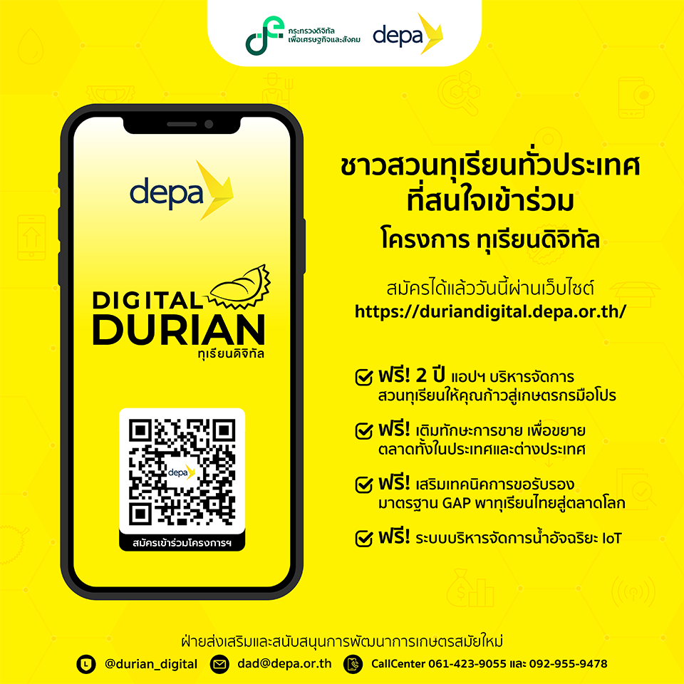 สำหรับเกษตรกรสวนทุเรียนที่สนใจสามารถสมัครเข้าร่วมโครงการทุเรียนดิจิทัลได้แล้ววันนี้ผ่านทางเว็บไซต์ https://duriandigital.depa.or.th หรือสอบถามข้อมูลเพิ่มเติมที่ 06 1423 9055 หรือ 09 2955 9478