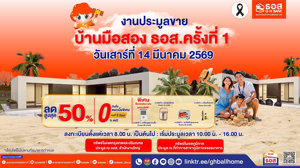 ธนาคารอาคารสงเคราะห์ (ธอส.) เดินหน้ากระตุ้นภาคอสังหาริมทรัพย์ จัดงานประมูลขายบ้านมือสอง ธอส. ครั้งที่ 1 ปี 2569 นำทรัพย์คุณภาพดี ทำเลเด่นกว่า 12,000 รายการทั่วประเทศ ออกจำหน่ายลดราคาสูงสุด 50% พร้อมรับสินเชื่อบ้านอัตราดอกเบี้ย 0% ต่อปี คงที่ 2 ปีแรก และของสมนาคุณมากมาย พบกันวันเสาร์ที่ 14 มีนาคม 2569