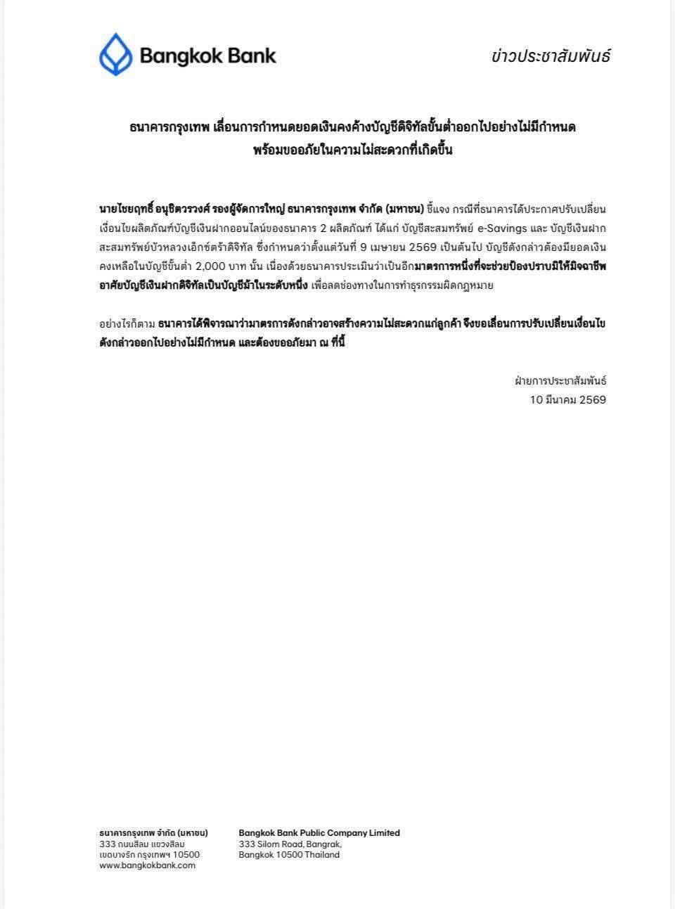 ธนาคารกรุงเทพ เลื่อนการกำหนดยอดเงินคงค้างบัญชีดิจิทัลขั้นต่ำออกไปอย่างไม่มีกำหนด พร้อมขออภัยในความไม่สะดวกที่เกิดขึ้นนายไชยฤทธิ์ อนุชิตวรวงศ์ รองผู้จัดการใหญ่ ธนาคารกรุงเทพ จำกัด (มหาชน) ชี้แจง กรณีที่ธนาคารได้ประกาศปรับเปลี่ยนเงื่อนไขผลิตภัณฑ์บัญชีเงินฝากออนไลน์ของธนาคาร 2 ผลิตภัณฑ์ ได้แก่ บัญชีสะสมทรัพย์ e-Savings และ บัญชีเงินฝากสะสมทรัพย์บัวหลวงเอ็กซ์ตร้าดิจิทัล ซึ่งกำหนดว่าตั้งแต่วันที่ 9 เมษายน 2569 เป็นต้นไป บัญชีดังกล่าวต้องมียอดเงินคงเหลือในบัญชีขั้นต่ำ 2,000 บาท นั้น เนื่องด้วยธนาคารประเมินว่าเป็นอีกมาตรการหนึ่งที่จะช่วยป้องปราบมิให้มิจฉาชีพอาศัยบัญชีเงินฝากดิจิทัลเป็นบัญชีม้าในระดับหนึ่ง เพื่อลดช่องทางในการทำธุรกรรมผิดกฎหมายอย่างไรก็ตาม ธนาคารได้พิจารณาว่ามาตรการดังกล่าวอาจสร้างความไม่สะดวกแก่ลูกค้า จึงขอเลื่อนการปรับเปลี่ยนเงื่อนไขดังกล่าวออกไปอย่างไม่มีกำหนด และต้องขออภัยมา ณ ที่นี้