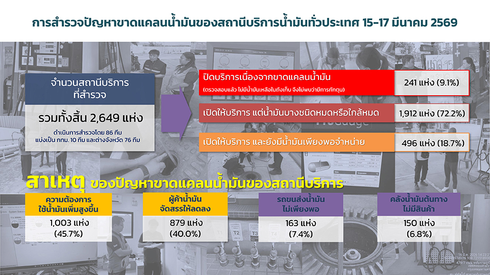 ที่ผ่านมา ธพ. ได้ดำเนินการออกตรวจการขาดแคลนน้ำมันเชื้อเพลิงของสถานีบริการทั่วประเทศ โดยเมื่อวันที่ 15 – 17 มีนาคม 2569 ทั้งสิ้น 2,649 แห่ง โดยเจ้าหน้าที่กรมธุรกิจพลังงาน และสำนักงานพลังงานจังหวัด พบว่ามีการปิดบริการเนื่องจากขาดแคลนน้ำมันเชื้อเพลิง จำนวน 247 แห่ง คิดเป็น 9.1% เปิดให้บริการแต่น้ำมันบางชนิดหมด หรือใกล้หมด 1,912 แห่ง คิดเป็น 72.2% และเปิดให้บริการมีน้ำมันเพียงพอจำหน่าย 496 แห่ง คิดเป็น 18.7% ซึ่งสาเหตุหลัก ๆ มาจากความต้องการใช้น้ำมันสูงขึ้น 45.7% ผู้ค้าน้ำมันจัดสรรให้ลดลง 40% รถขนส่งน้ำมันไม่เพียงพอ 7.4% และคลังน้ำมันไม่มีสินค้า 6.8%