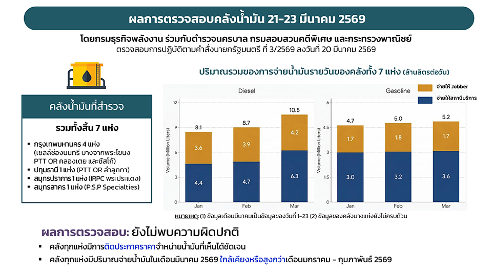 อีกทั้ง เมื่อวันที่ 21 – 23 มีนาคม 2569 ได้ลงพื้นที่ตรวจสอบคลังน้ำมันเพื่อสร้างความมั่นใจ ร่วมกับตำรวจนครบาล กรมสอบสวนคดีพิเศษ และกระทรวงพาณิชย์ รวมทั้งสิ้น 7 แห่ง ยังไม่พบความผิดปกติในเรื่องของการติดป้ายราคา และทุกแห่งมีปริมาณจ่ายน้ำมันในเดือนมีนาคม ใกล้เคียงหรือสูงกว่าเดือน มกราคม - กุมภาพันธ์ 2569 และเมื่อวันที่ 25 มีนาคม 2569 กรมธุรกิจพลังงาน ร่วมกับ กรมสอบสวนคดีพิเศษ และสำนักงานพลังงานจังหวัดสระบุรี ลงพื้นที่ตรวจสอบพื้นที่ต้องสงสัยจำนวน 3 จุดในอำเภอเสาไห้ จังหวัดสระบุรี หลังได้รับข้อมูลเบาะแสการลักลอบค้าหรือกักตุนน้ำมัน โดยเจ้าหน้าที่ตรวจพบการจัดเก็บน้ำมันโดยไม่ได้แจ้งและไม่ได้รับอนุญาต รวมประมาณ 40,000 ลิตร และได้ยึดน้ำมันของกลางไว้เป็นหลักฐานเพื่อดำเนินคดี การกระทำนี้เข้าข่ายความผิดตามกฎหมาย อาจถูกจำคุกไม่เกิน 2 ปี หรือปรับไม่เกิน 200,000 บาท หรือทั้งจำทั้งปรับ และหากเป็นการกระทำที่เข้าข่ายกักตุนเพื่อแสวงหากำไร หรือทำให้เกิดความปั่นป่วนในตลาด อาจเข้าข่ายความผิดตามกฎหมายอื่นเพิ่มเติม