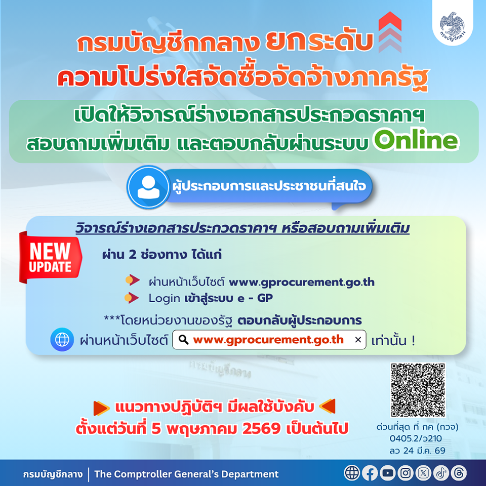 สำหรับผู้ประกอบการหรือประชาชนที่สนใจ สามารถแสดงความคิดเห็นที่มีต่อร่างเอกสารประกวดราคาฯ หรือสอบถามรายละเอียดเพิ่มเติม (กรณีหน่วยงานของรัฐกำหนดให้ผู้ประกอบการสามารถสอบถามรายละเอียดเพิ่มเติม) ผ่าน 2 ช่องทาง ได้แก่ (1) เว็บไซต์ www.gprocurement.go.th (2) Login เข้าสู่ระบบ e - GP โดยหน่วยงานของรัฐจะแจ้งผลกลับผ่านทางเว็บไซต์ www.gprocurement.go.th เท่านั้น ซึ่งจะมีผลใช้บังคับตั้งแต่วันที่ 5 พฤษภาคม 2569 เป็นต้นไป ดังนั้น หน่วยงานของรัฐที่นำร่างประกาศและร่างเอกสารประกวดราคาฯ เผยแพร่เพื่อรับฟังความคิดเห็น ภายหลังจากวันที่มีผลใช้บังคับ ให้หน่วยงานของรัฐดำเนินการแก้ไขแบบประกาศประกวดราคาอิเล็กทรอนิกส์ ได้แก่ แบบประกาศประกวดราคาซื้อ แบบประกาศประกวดราคาจ้าง และแบบประกาศประกวดราคาจ้างก่อสร้าง โดยเพิ่มเติมข้อความในแบบประกาศประกวดราคาฯ ตามที่คณะกรรมการวินิจฉัยกำหนด โดยสามารถศึกษารายละเอียดได้จากหนังสือ ด่วนที่สุด ที่ กค (กวจ) 0405.2/ว 210 ลงวันที่ 24 มีนาคม 2569