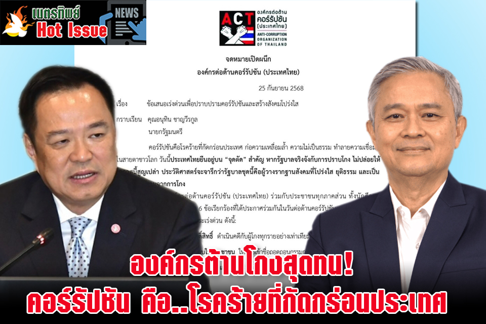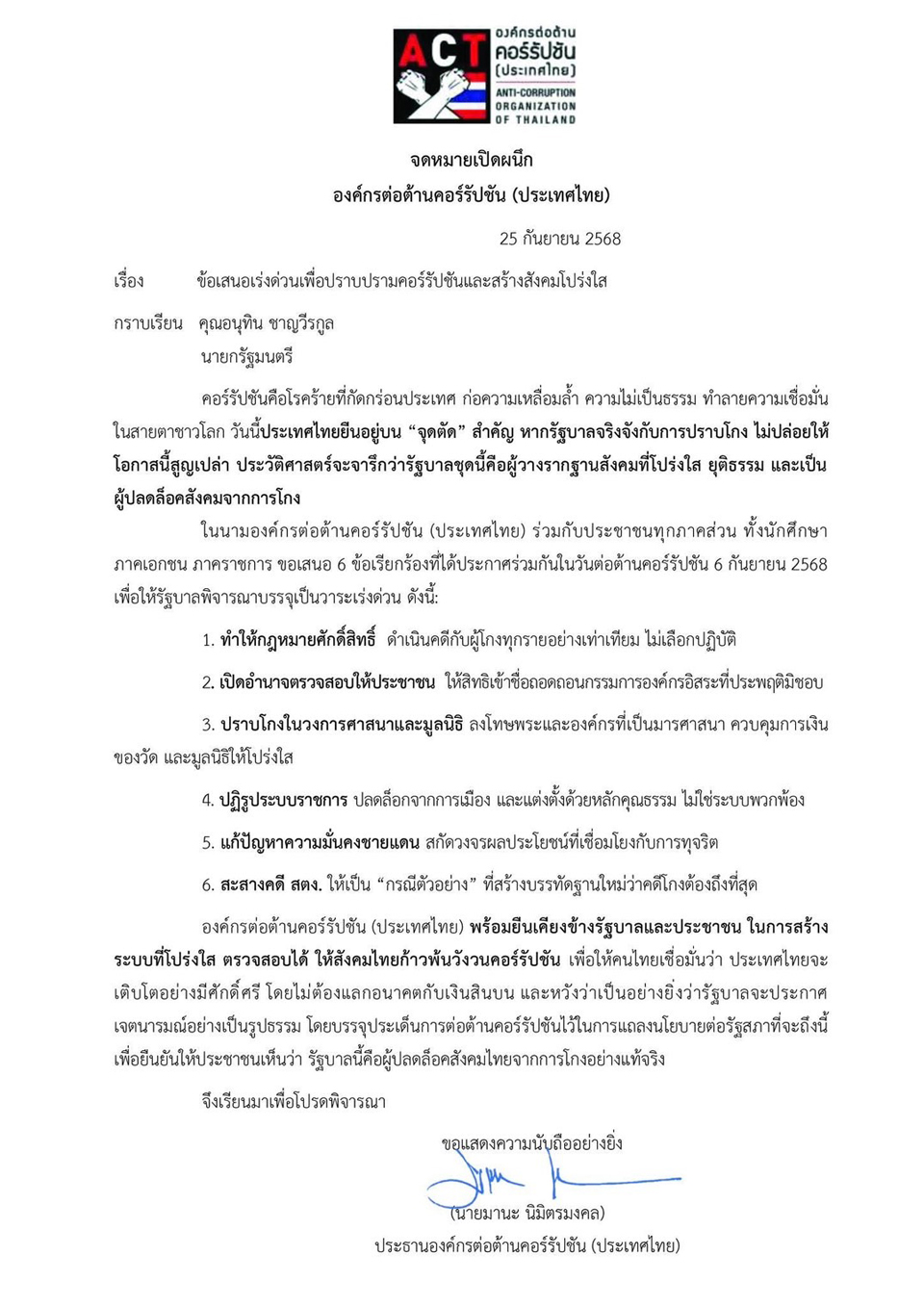 ล่าสุด ดร.มานะ นิมิตรมงคล ประธานองค์กรต่อต้านคอร์รัปชัน (ประเทศไทย) หรือ ACT ทำจดหมายเปิดผนึกองค์กรต่อต้านคอร์รัปชัน (ประเทศไทย) ร่อนด่วนถึง นายอนุทิน ชาญวีระกุล นายกรัฐมนตรี เสนอเร่งด่วนเพื่อปราบปรามคอร์รัปชันและสร้างสังคมโปร่งใส โดยระบุว่า..