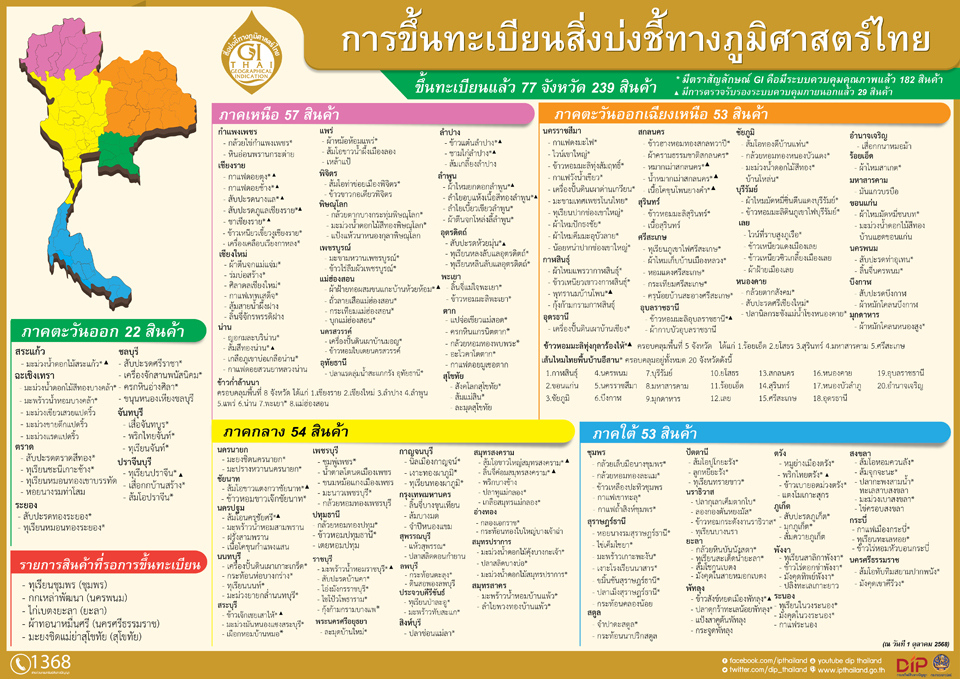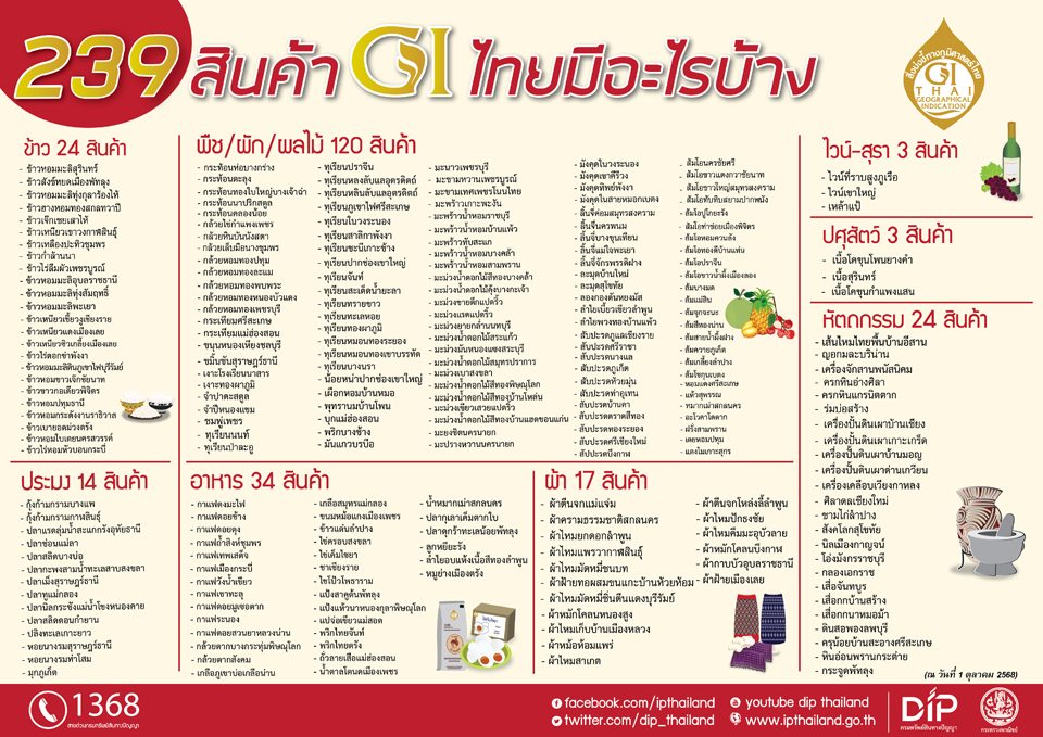 ทั้งนี้ ในปีงบประมาณ พ.ศ. 2568 กรมทรัพย์สินทางปัญญาได้ขึ้นทะเบียนสินค้า GI ไทย 27 รายการ สร้างมูลค่าทางเศรษฐกิจกว่า 6,100 ล้านบาท ทำให้จำนวนสินค้า GI ของไทยในปัจจุบันอยู่ที่ 239 รายการ รวมมูลค่าการตลาดทั้งสิ้น 82,000 ล้านบาท (เพิ่มขึ้นจากปี 2567 ที่มี GI ของไทย 212 รายการ มูลค่าการตลาด 76,000 ล้านบาท)