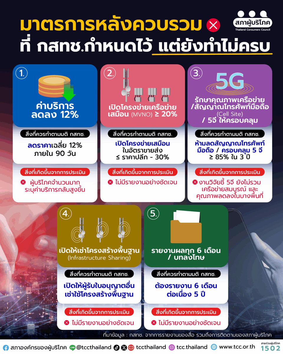 เป็นเวลาร่วม 3 ปีนับตั้งแต่เมื่อวันที่ 20 ตุลาคม 2565 หลังจากคณะกรรมการกิจการกระจายเสียง กิจการโทรทัศน์ และกิจการโทรคมนาคมแห่งชาติ (กสทช.) ได้มีมติ “รับทราบ” ที่เปิดทางให้เกิดการควบรวมกิจการของบริษัทโทรคมนาคมรายใหญ่สองค่ายก่อให้เกิดการผูกขาดในธุรกิจสัญญาณมือถือและอินเทอร์เน็ต โดย กสทช. อ้างว่าการออกเงื่อนไขมาตรการพิเศษ เพื่อ “ป้องกันผลกระทบและคุ้มครองผู้บริโภค” แต่ผ่านมาถึงปัจจุบันในปี 2568 สภาผู้บริโภค ได้ติดตามผลจากการควบรวมและเสียงเรียกร้องจากผู้บริโภคอย่างใกล้ชิด สะท้อนว่าผู้บริโภคต่างได้รับผลกระทบจากสิทธิการเลือกของผู้บริโภคที่ลดลงในตลาดโทรคมนาคมจากการเหลือผู้เล่นหลักเพียงสองราย รวมถึงพบว่ามาตรการพิเศษ 5 ด้าน ที่ กสทช. กำหนดภายหลังการมีมติรับทราบควบรวมนั้น กลับไม่มีหลักฐานชัดเจนว่าได้รับการดำเนินการจริง แต่มีผลต่อเนื่องจากค่าบริการที่เพิ่มขึ้นและความเร็วสัญญาณที่ลดลง