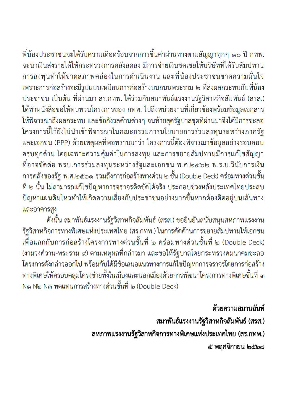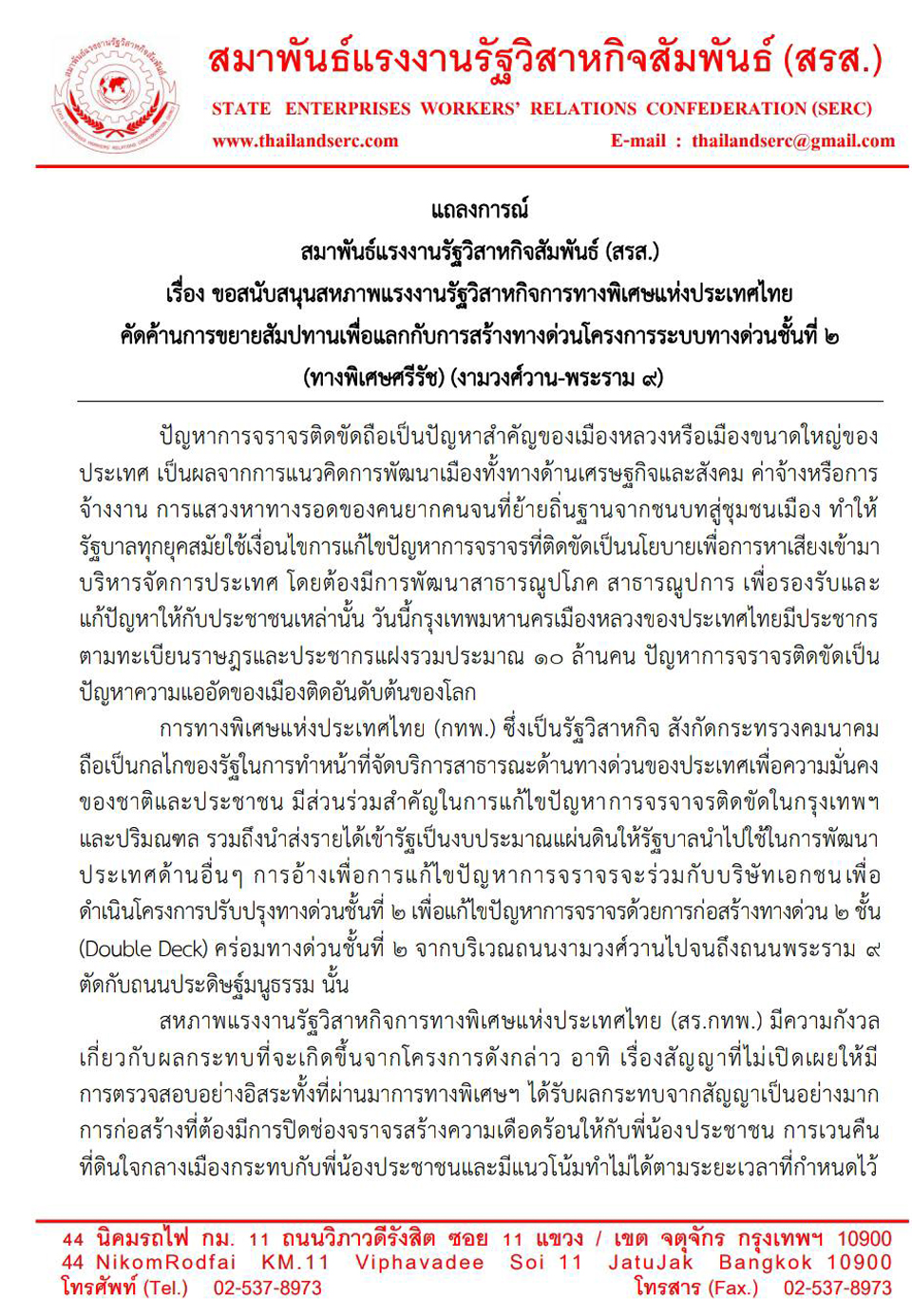 โดย สมาพันธ์แรงงานรัฐวิสาหกิจสัมพันธ์ (สรส.) เปิดเวทีสาธารณะ “Double Deck ทางด่วนชั้นที่ 2 ผลประโยชน์ของชาติ หรือของใคร?” กรณีสัญญาสัมปทานระหว่าง การทางพิเศษแห่งประเทศไทย (กทพ.) และ บริษัท ทางด่วนและรถไฟฟ้ากรุงเทพ จำกัด (มหาชน) หรือ BEM ภายใต้ข้อตกลง “ลดค่าทางด่วน 50 บาท” กับการขยายอายุสัมปทานอีก 22 ปี 5 เดือน สรส. สภาผู้บริโภค ยื่นคัดค้านทำรัฐ ประชาชนเสียประโยชน์