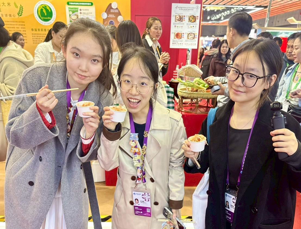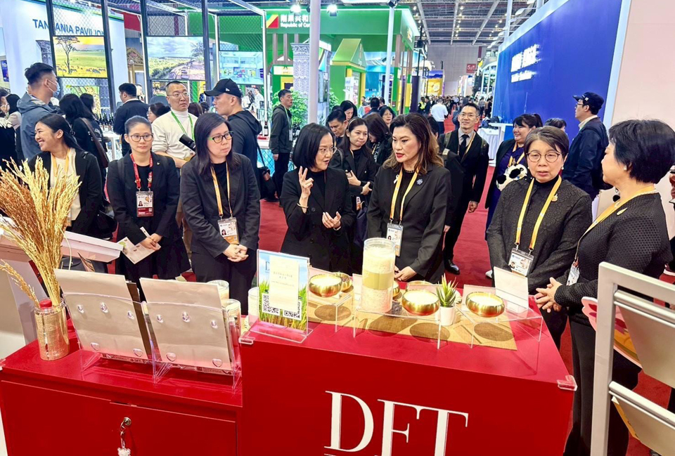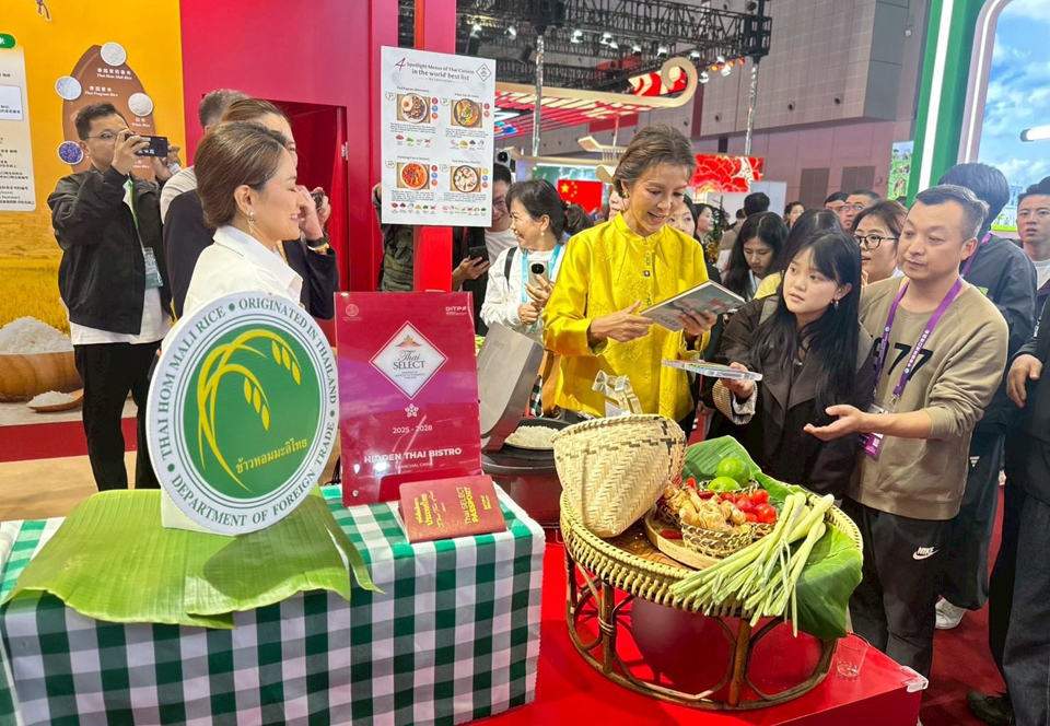 กรมฯ ได้เข้าร่วมงาน CIIE 2025 เป็นปีที่ 3 ติดต่อกัน โดยได้จัดกิจกรรมประชาสัมพันธ์ข้าวไทยบนพื้นที่ Thailand Pavilion ของกรมส่งเสริมการค้าระหว่างประเทศในส่วนของ Country Exhibition ภายใต้แนวคิด “ศาลาไทย” ที่เน้นนำเสนอสินค้าอาหารไทย “Thai SELECT” และความหลากหลายของข้าวไทย สินค้าไลฟ์สไตล์และสุขภาพ–สปา “Thai Style” สินค้าที่ได้รับตราสัญลักษณ์ T Mark และ PM Award และจุดเด่นการท่องเที่ยวของไทย “Thai Experiences” โดยเมื่อวันที่ 6 พฤศจิกายน 2568 กรมส่งเสริมการค้าระหว่างประเทศได้จัดพิธีเปิด Thailand Pavilion ซึ่งได้รับเกียรติจาก ดร. กิริฎา เภาพิจิตร ผู้ช่วยรัฐมนตรีประจำกระทรวงพาณิชย์ เป็นประธาน และยังได้เข้าเยี่ยมชมคูหาของกรมการค้าต่างประเทศ โดยได้ร่วมสาธิตการทำเมนูผัดกะเพราหมูสับทานคู่กับข้าวหอมมะลิไทย แจกให้ผู้เข้าเยี่ยมชมคูหาได้ทดลองชิม ซึ่งได้รับความสนใจเป็นอย่างมาก และต่างชื่นชมในความหอม ความนุ่ม และรสชาติของข้าวหอมมะลิไทย พร้อมแสดงความสนใจซื้อเพื่อนำกลับไปหุงทานที่บ้านและซื้อเป็นของขวัญในช่วงเทศกาลสำคัญของจีน นอกจากนี้ ในคูหาของกรมการค้าต่างประเทศยังได้จัดกิจกรรมสำคัญ ได้แก่ การจัดนิทรรศการและการจัดแสดงตัวอย่างข้าวไทยชนิดต่างๆ การจัดกิจกรรมให้ผู้เข้าเยี่ยมคูหาร่วมตอบคำถามเกี่ยวกับวิธีการเลือกซื้อข้าวหอมมะลิไทยเพื่อรับของที่ระลึก และการสาธิตการปรุงอาหารไทยทานคู่กับข้าวหอมมะลิไทยวันละ 2 รอบ โดยได้รับความสนใจจากผู้นำเข้า ผู้ซื้อและผู้บริโภคชาวจีน รวมทั้งสื่อมวลชนของจีน ตลอดการจัดงาน 6 วัน ประมาณ 5,000 คน